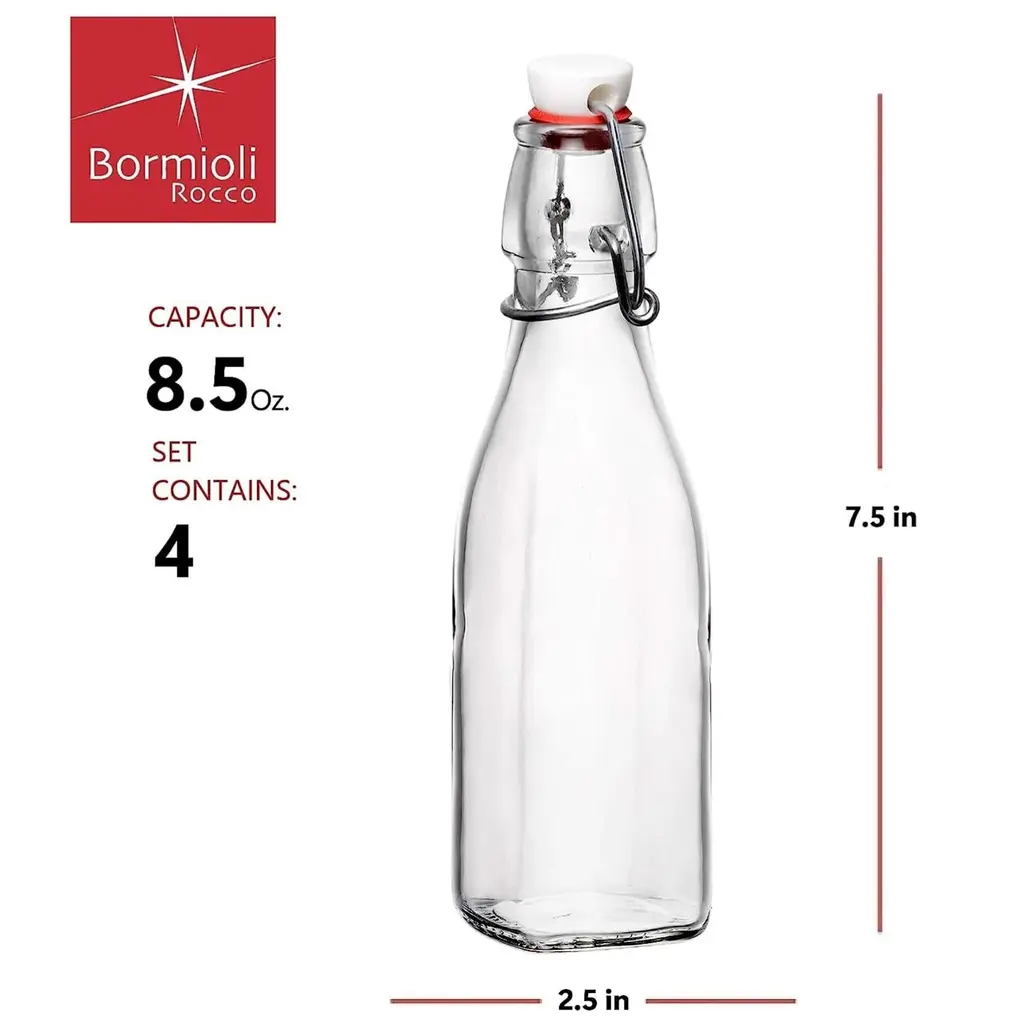Bormioli Rocco 8.5oz Swing Bottle (Set of 6) - Reusable Glass Bottles with Airtight Leakproof Swing Tops, BPA-Free Office Water Bottle, Great for Homemade Syrups, Dressings, Infused Oils, Fresh Juices - NewBring both function and style to your kitchen with the Bormioli Rocco Swing Bottle Set of 6. Each 8.5 oz bottle is crafted from durable, reusable glass, providing a sustainable alternative to single-use plastics. These versatile glass bottles are more than just beautiful – they're designed to support everyday cooking and beverage prep. Whether you're looking to store water and fresh drinks, prepare homemade syrups, or craft infused oils and dressings, this set has you covered. Home chefs will appreciate the secure swing-top caps, which use a metal clasp and gasket to deliver a reliable leakproof and airtight seal. That means no spills in the fridge, no leaks during transport, and contents that stay fresher, longer. These bottles are not only functional but also a visually appealing way to upgrade your pantry or countertop organization. Their compact 8.5 oz size makes them ideal for small-batch creations or daily use. Cleaning is simple – the glass body is dishwasher safe, while the metal hardware should be gently hand washed to preserve the airtight seal. Whether you're crafting DIY gifts, bottling cold-pressed juices, or simply staying hydrated, the Bormioli Rocco Swing Bottle Set adds both practicality and charm to any kitchen. FEATURES:COLOR:MATERIAL:WHAT'S IN THE BOX:PACKAGING: Retail Packaging