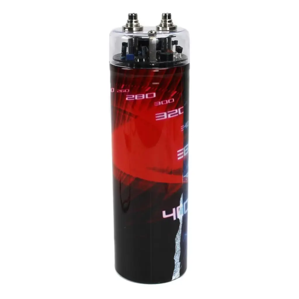 The Boss Farad Car Audio Capacitor has a series resistant. This capacitor has a low level input voltage and a high input voltage. This is a remote terminal screw in capacitor that measures 10.3 x 3 x 3 inches. The voltage displays red on the digital voltage display. The capacitor also includes audible warnings if it is set up incorrectly or there is an issue such as reverse polarity, low battery voltage or voltage overload. Get more performance out of your car audio with the Boss Farad Digital Capacitor with LED.