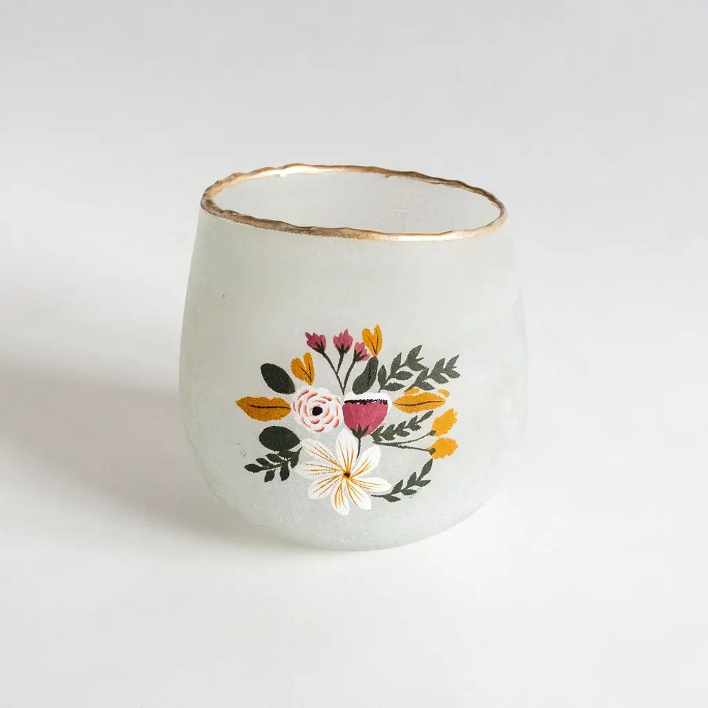 Dried, pressed flowers are delicately affixed within our double-walled, stemless wine glass. Handcrafted of mouth-blown borosilicate glass and genuine botanicals, it's truly a one-of-a-kind find. Available in a variety of colors to collect, this glass adds a whimsical and romantic touch to every sip.