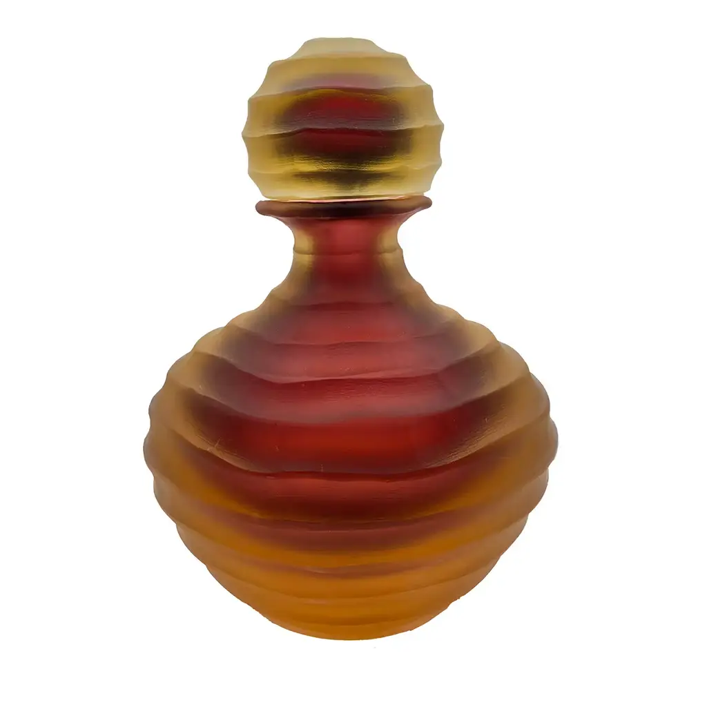 The mesmerizing blue and red hues of this miniature glass bottle showcase the exceptional craftsmanship of Murano glass artisans. Made entirely by hand, this exquisite piece can be filled with any type of fragrance and can also be used as a perfume holder. Completed by the graceful gold veined topper, this elegant small bottle will enhance any tabletop or cabinet with ease.