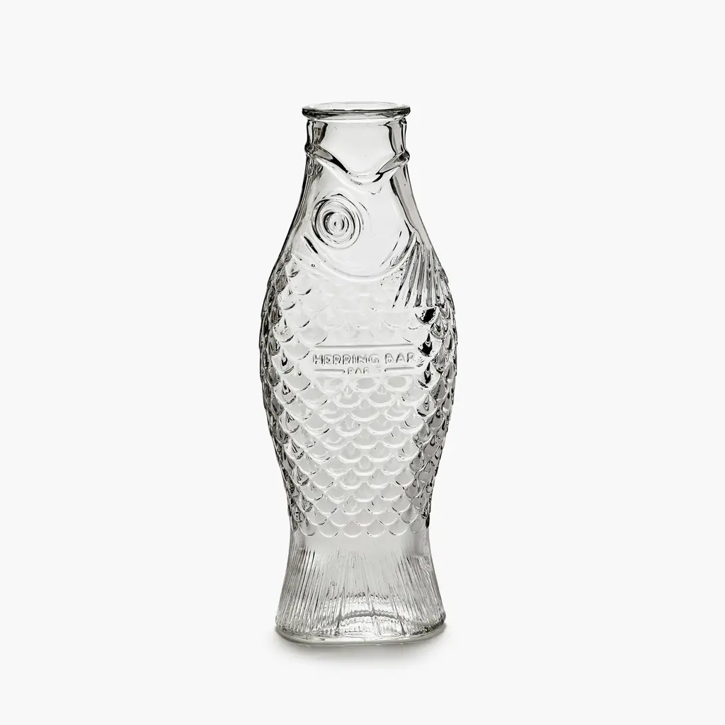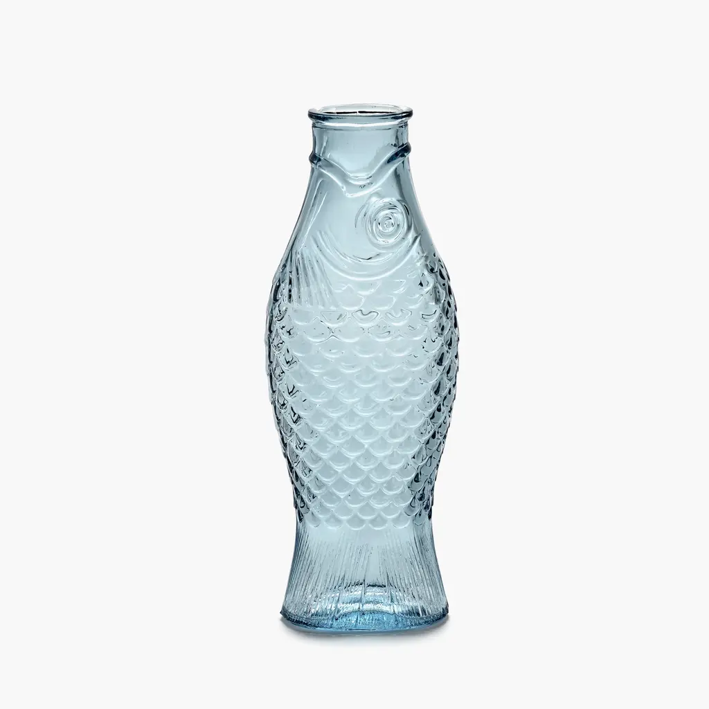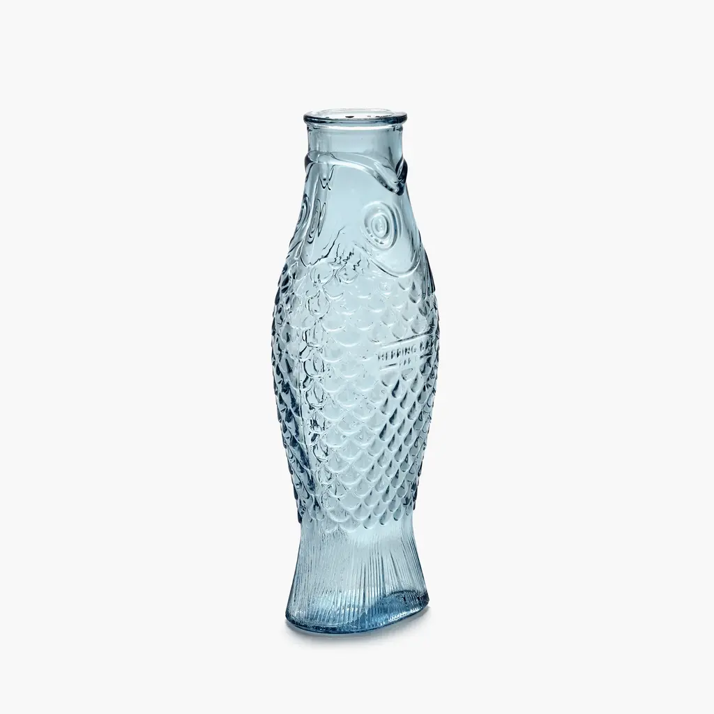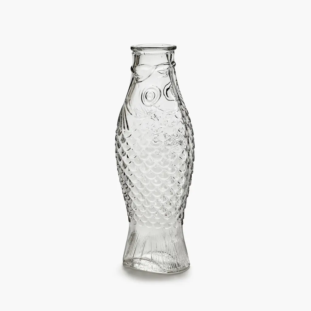 The perfect companion for convivial meals shared with family and friends, the Serax Fish&Fish Bottle transforms the humble water carafe into a striking design object. Award-winning designer Paola Navone created this series with her typical unconventional style that brings joy and vibrancy to everyday moments. The Fish&Fish bottles are shaped like a standing herring, with the tail acting as a solid base. Highly detailed, the carafe features intricate fish scale motifs that add a beautiful tactility to the design. The flat and softly curved shape of the bottle also makes it easier to hold while serving guests with water, juice or wine. Crafted with a special technique to ensure that the details are sharp and perfect, each bottle is solid-pressed from high-quality glass. Versions include clear glass as well as maritime-inspired hues of green and blue. The Serax Fish&Fish Bottle has a capacity of 28.74 fl oz and suits both daily use and special occasions. Complement the carafe with the other Fish&Fish glassware from the same collection.