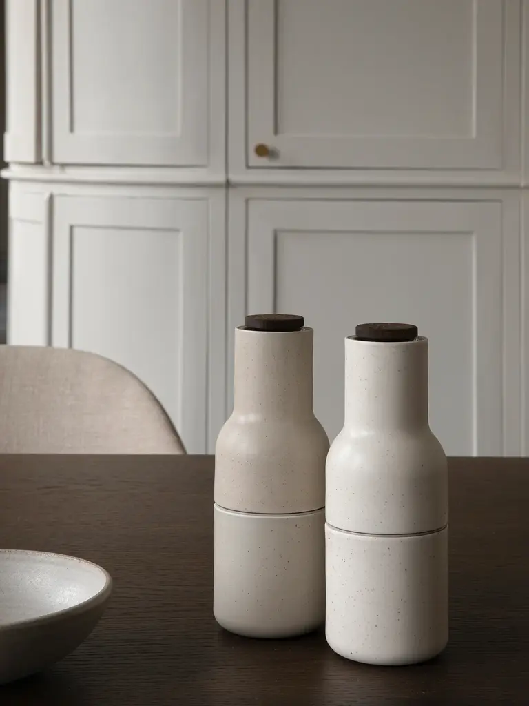 Atypical for traditional salt and pepper mills, Audo’s Bottle Grinders are shaped like bottles to cleverly trick the user into engaging with the design in a playful and experimental way. Fitted with a powerful ceramic mill that makes light work of grinding a wide range of spices, Bottle Grinders are easy to operate, fill and clean, and the upright design ensures surfaces remain free from unwanted residue. Available in a range of colors and finishes, the collection’s most recent additions are carefully crafted from ceramic, featuring an ivory or grey matte glaze finish that displays small, deliberate imperfections for a handmade look and feel. The versatile kitchen accessories come fitted with a harmonizing walnut wood lid. Care instructions:Avoid placing bottle grinders in direct sunlight. Use a soft dry cloth to clean. For stains, use a light dish-washing soap. Do not use any cleaners with chemicals or harsh abrasives. To avoid noisy grinding, make sure the grinder is properly dry before refilling. Each set includes two bottle grinders.