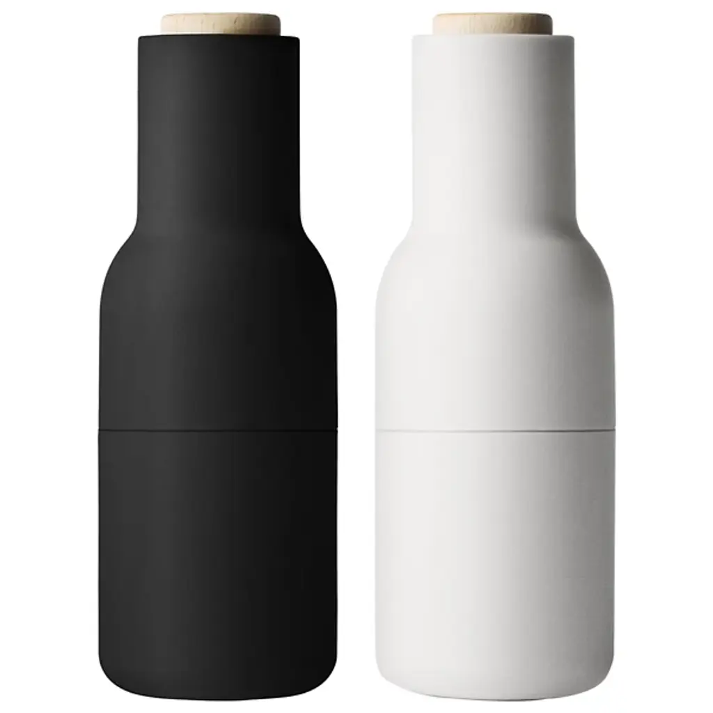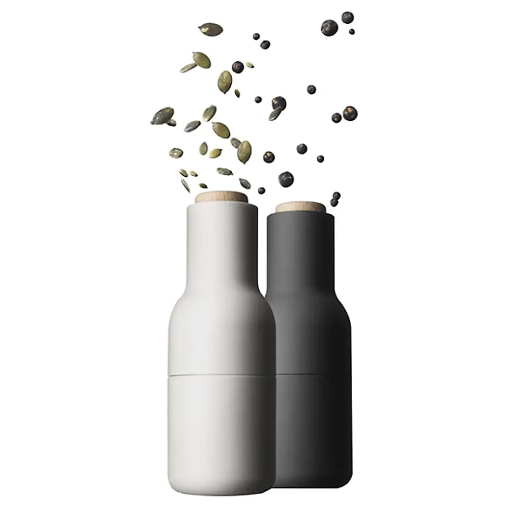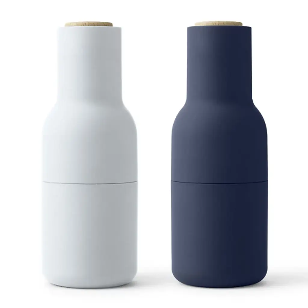 The Bottle Grinder, Set of 2 by Audo Copenhagen, formerly known as Menu allows you to mill salt, pepper, or any other spices in a clean, minimalist style. An expressive design by Norm Architects, these two bottle-shaped grinders appear in complementary and coordinated colors to draw the eye, adding a restrained elegance to their surroundings. The shape suggests liquid, but delivers dried goods, adding a playful edge that meets practical design, with the mill mechanisms elevated to control waste and mess on the tabletop.