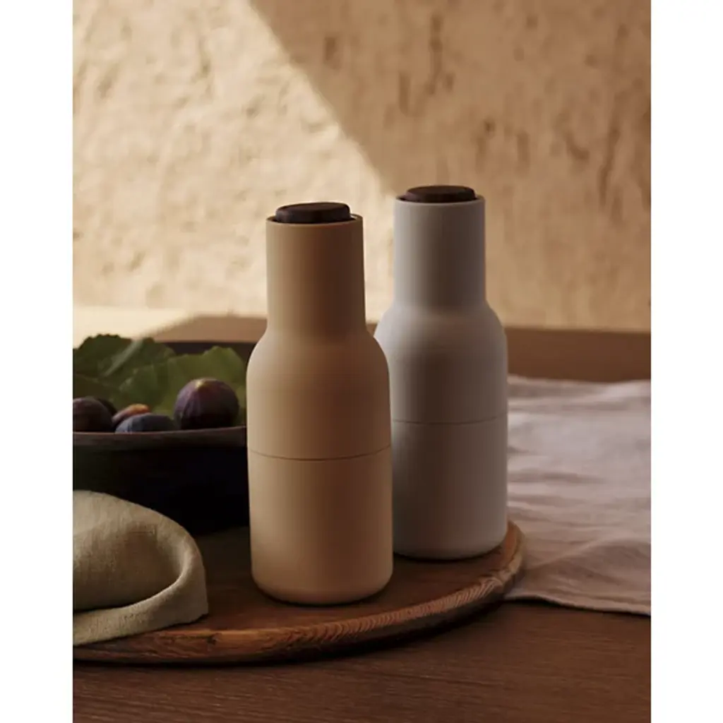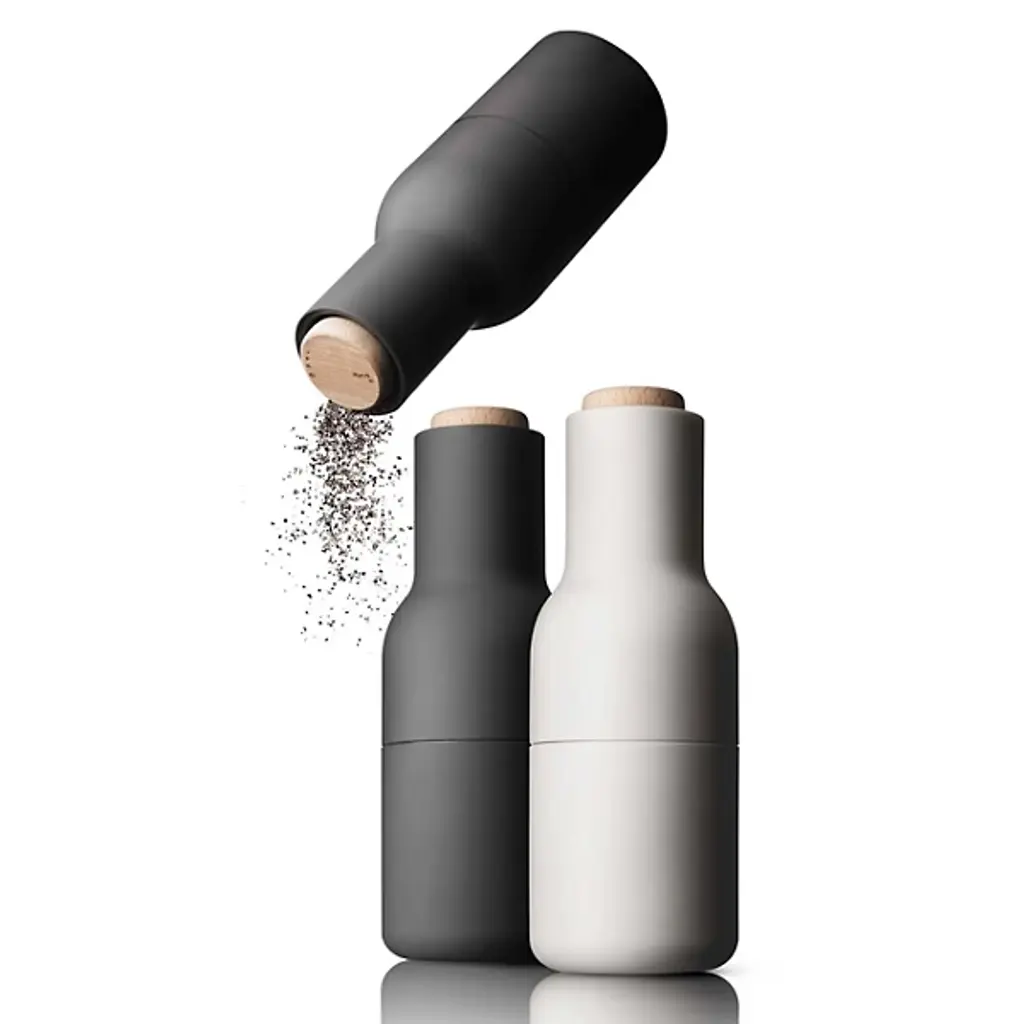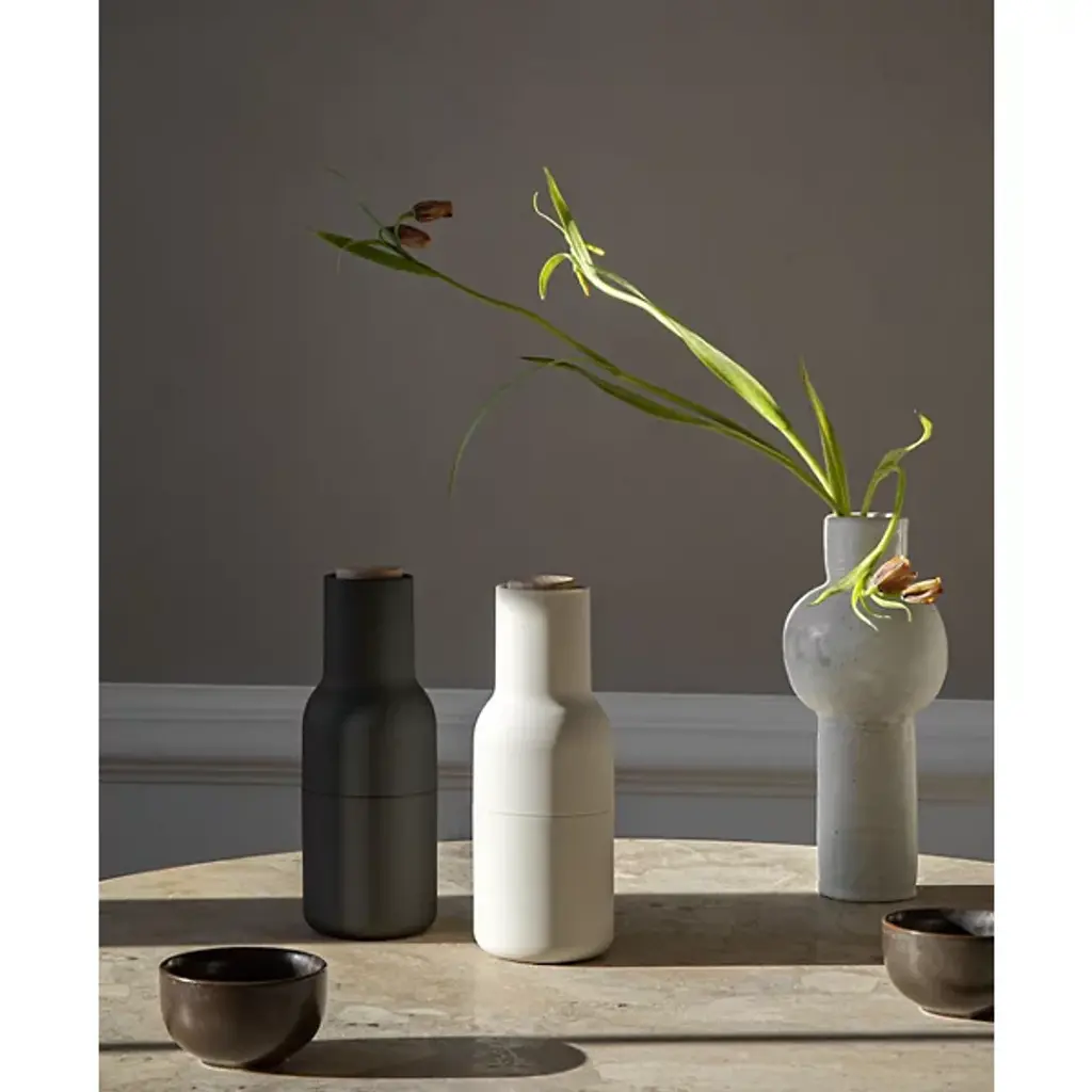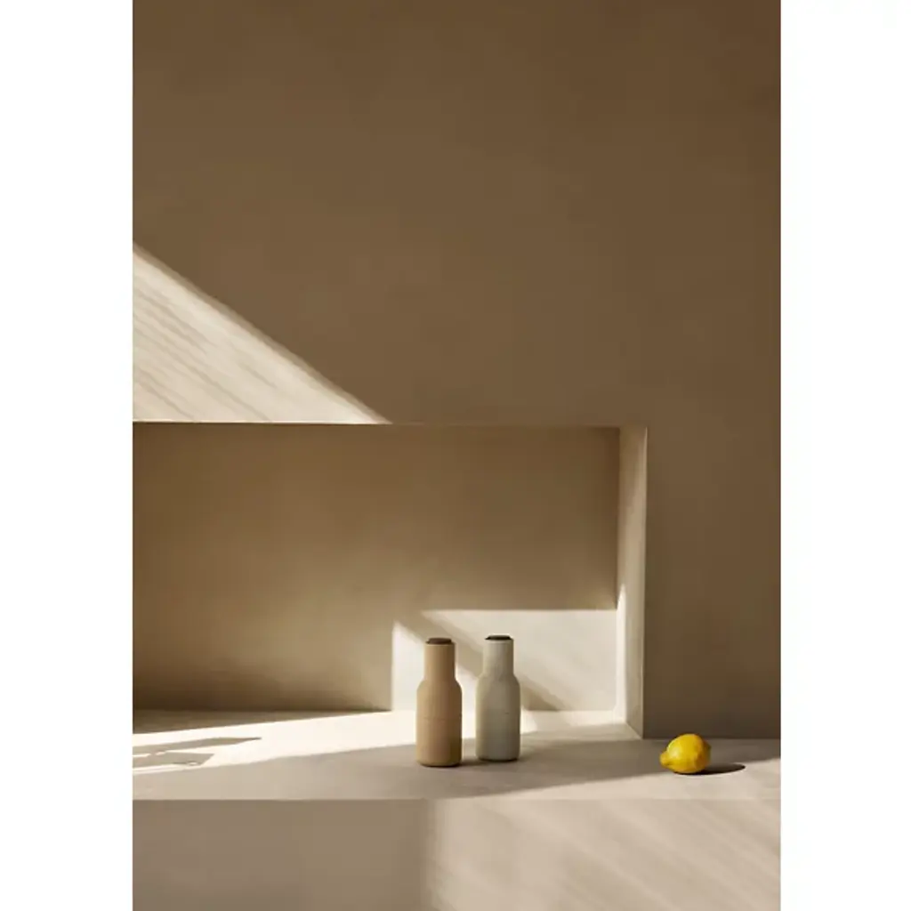 The Bottle Grinder, Set of 2 by Audo Copenhagen, formerly known as Menu allows you to mill salt, pepper, or any other spices in a clean, minimalist style. An expressive design by Norm Architects, these two bottle-shaped grinders appear in complementary and coordinated colors to draw the eye, adding a restrained elegance to their surroundings. The shape suggests liquid, but delivers dried goods, adding a playful edge that meets practical design, with the mill mechanisms elevated to control waste and mess on the tabletop.