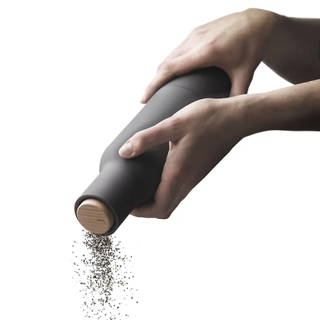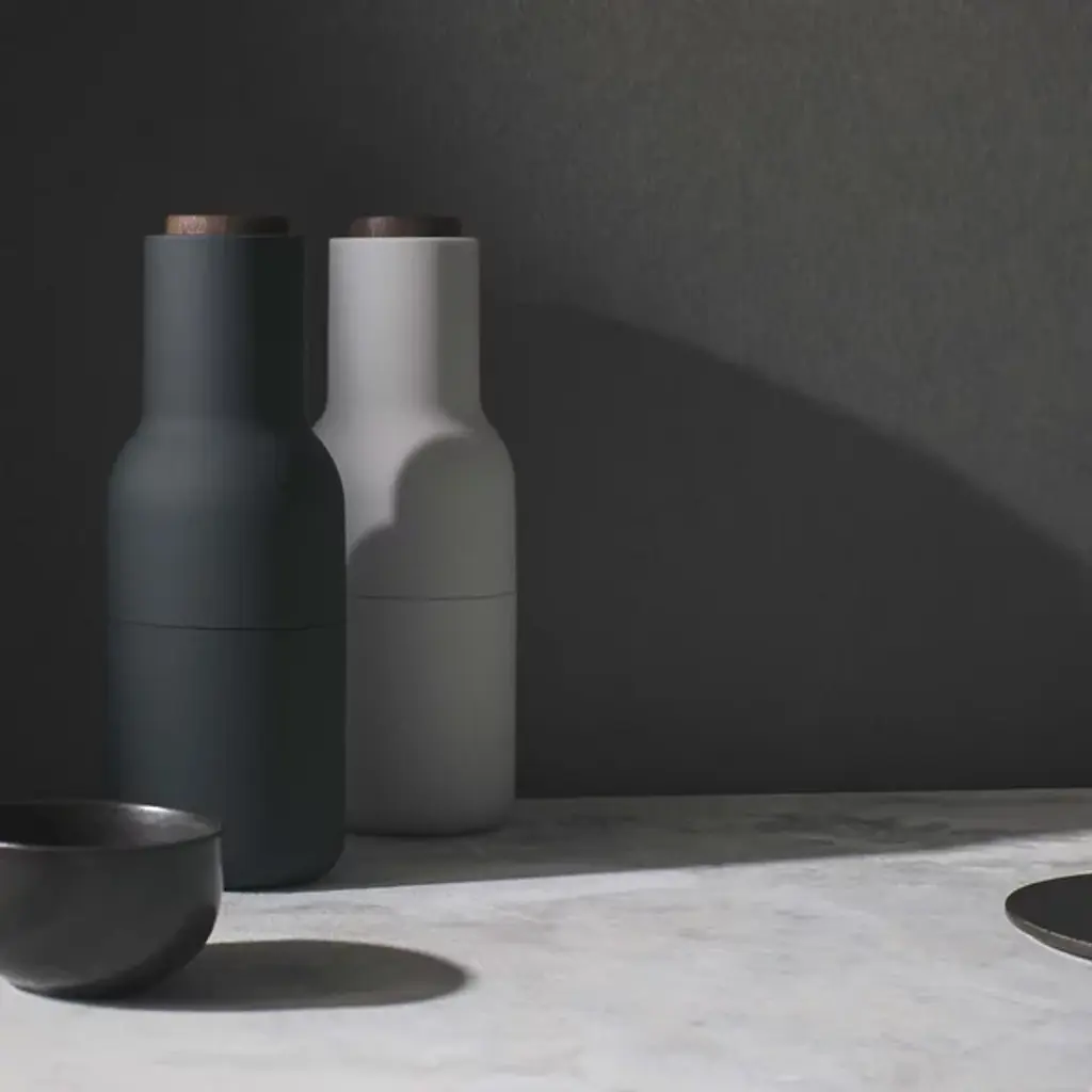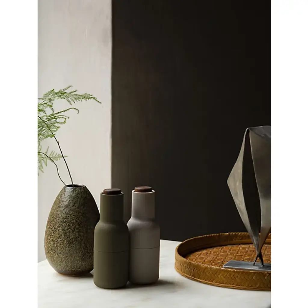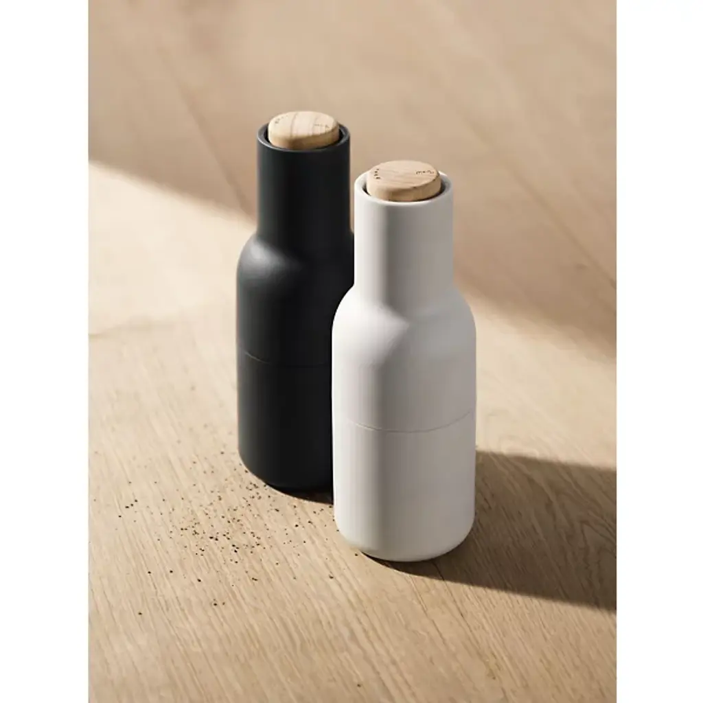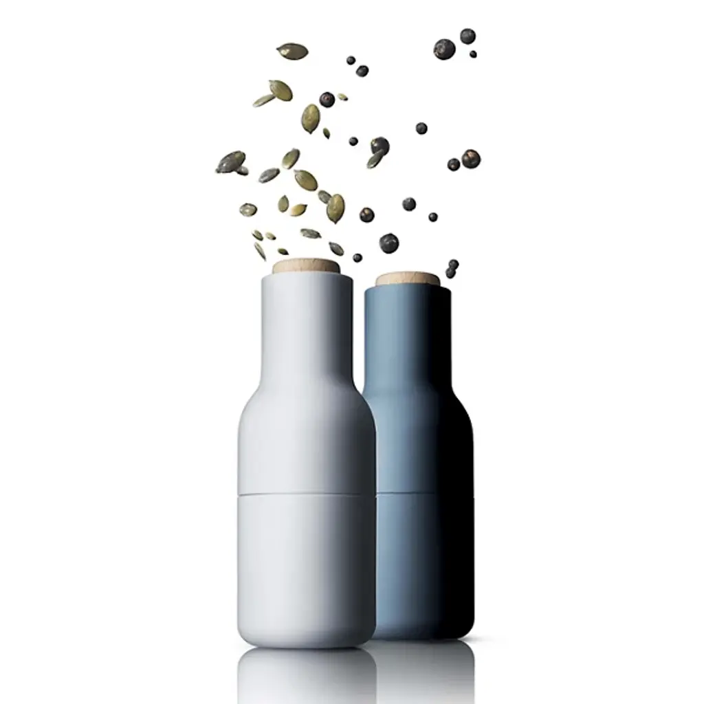 The Bottle Grinder, Set of 2 by Audo Copenhagen, formerly known as Menu allows you to mill salt, pepper, or any other spices in a clean, minimalist style. An expressive design by Norm Architects, these two bottle-shaped grinders appear in complementary and coordinated colors to draw the eye, adding a restrained elegance to their surroundings. The shape suggests liquid, but delivers dried goods, adding a playful edge that meets practical design, with the mill mechanisms elevated to control waste and mess on the tabletop.