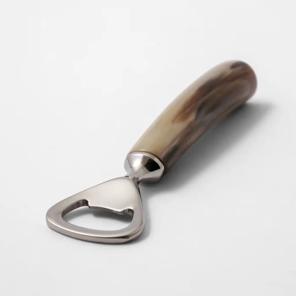 Add a touch of sophistication to the bar cart with this horn-handled bottle opener—crafted with style and durability in mind. Expertly handmade of 18/10 stainless steel and veined blonde natural horn, the sleek design highlights the beautiful, distinctive qualities of the horn and metal. Delivered in a handmade box with a padded, satin-lined interior, perfect for safekeeping. Part of the Artemide Collection.