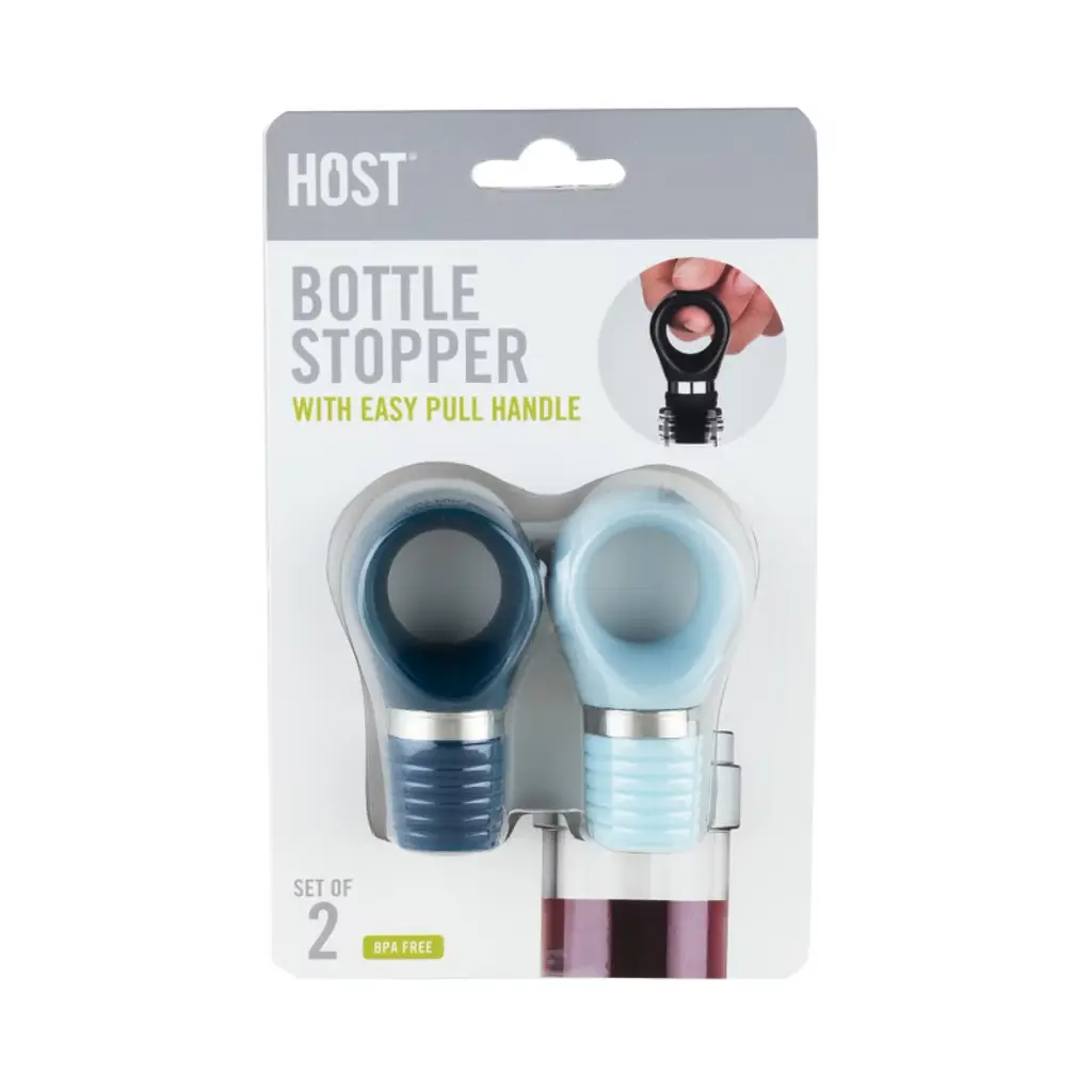 Preserve your partially-consumed bottle of wine with the HOST® Bottle Stopper. It provides an airtight seal while its easy pull handle allows for easy installment and removal from standard wine bottles. Set of 2 Stainless steel metal band BPA free Dishwasher safe