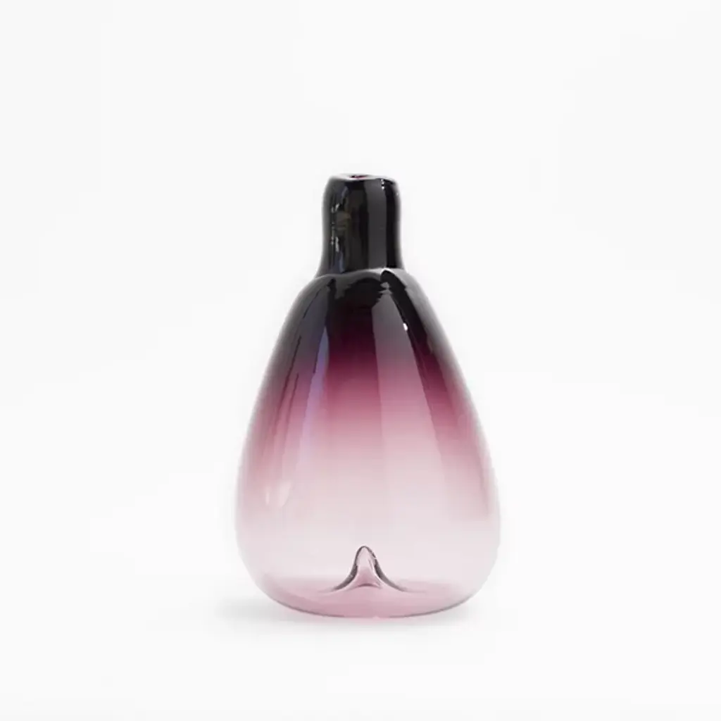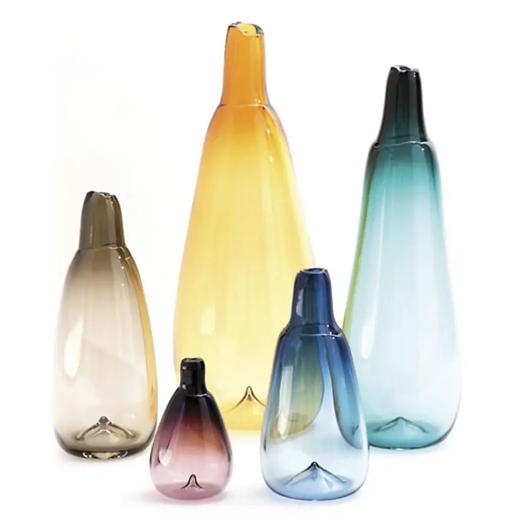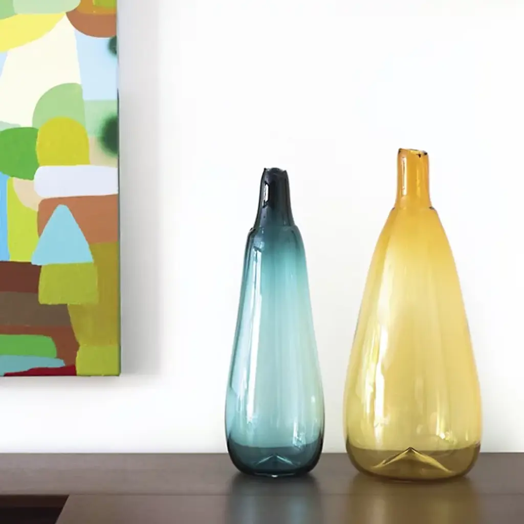 Hand-blown in the Czech Republic. By Sklo. The Bottle Vessels are exquisite objet d'art. Each neck is double-dipped to create a graduation of color from light to dark, while the bottoms have a slight indent detail for added interest. Broken hot from the glass blower's pipe, the mouth of each piece is truly unique. Add a splash of color with a single vessel, or create a stunning focal point by grouping several colors together.