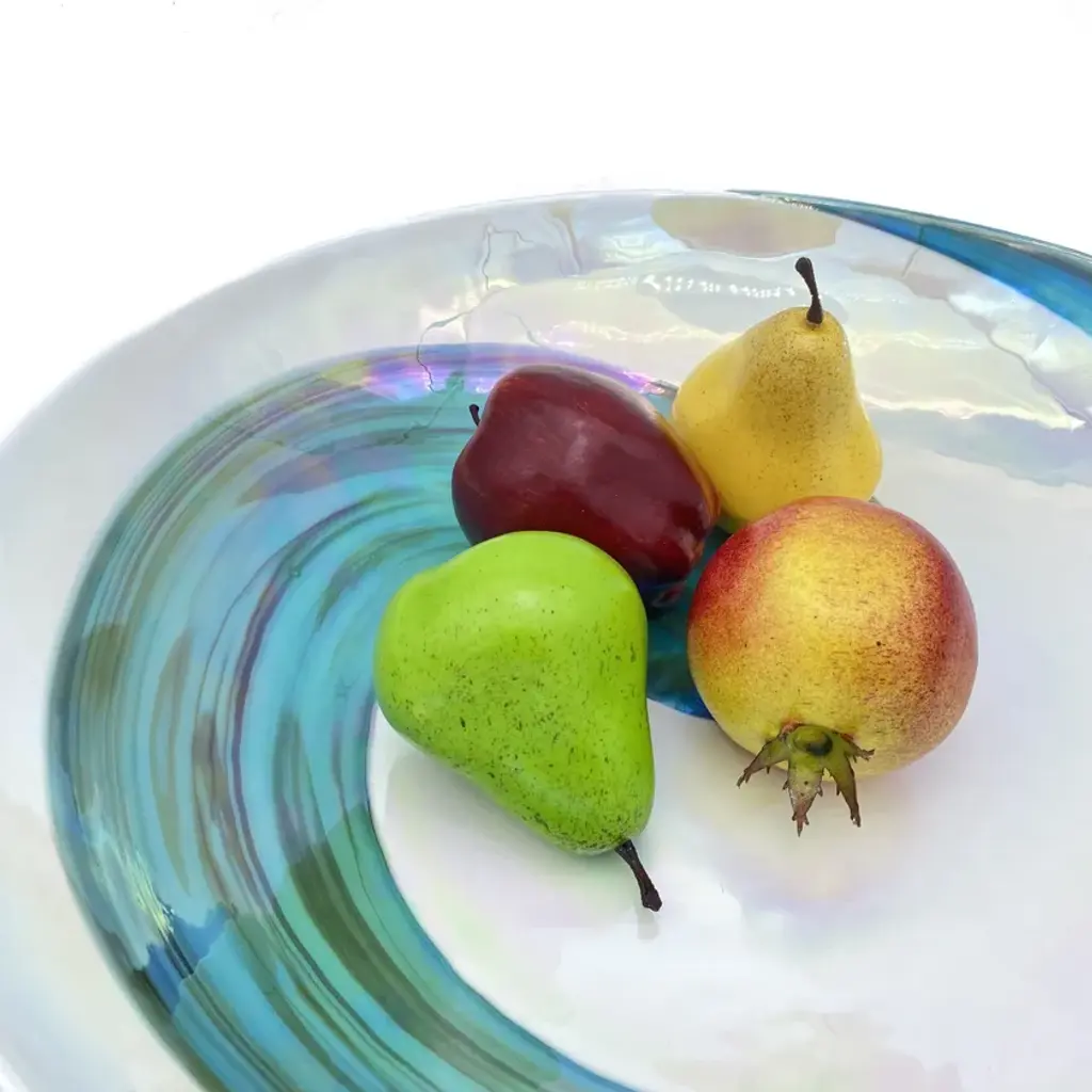 BIFORA is an elegant Murano glass decorative plate with a green water and ivory spiral pattern. This is a true unique and eye-catching artwork, perfect for any home space. Whether you're looking for an elegant addition to decorate your dining room or an original Venetian glass gift idea to amaze someone, these decorative fruit plates in Venetian glass are the perfect solution! Find the perfect match for your home and create a truly unique and original interior design. All our products are handcrafted and of the highest production quality. Non-substantial variations in shape, size, color, and/or minor imperfections are inevitable and are typical of manual glasswork, highlighting the artisanal craftsmanship.
