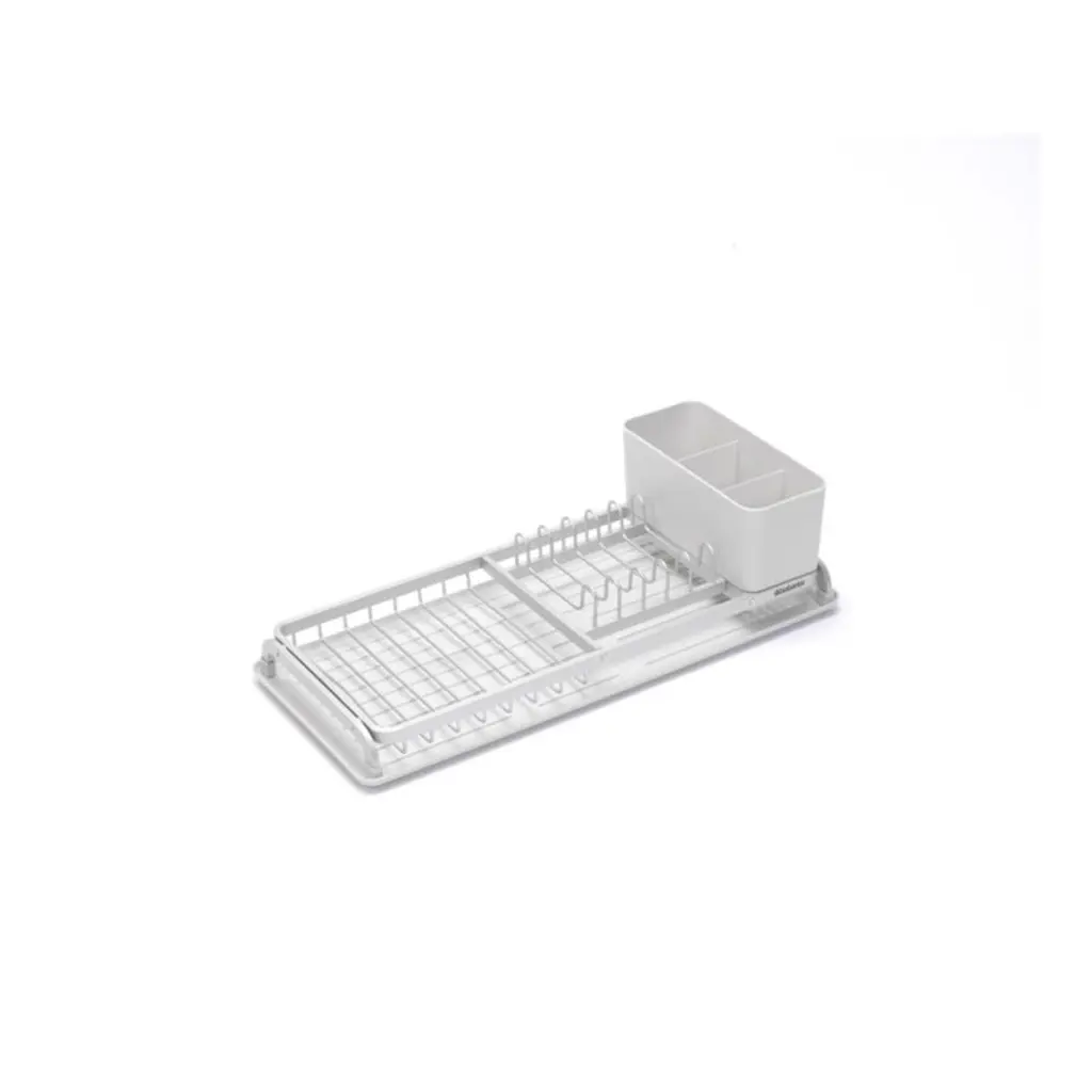 Graphically gridded, this petite dish-drying rack has a beautifully minimalist presence and small footprint on kitchen countertops. Crafted of corrosion-resistant materials in palest grey, the compact, low-profile rack cradles dinnerware, glassware, cutlery and cookware as they dry. Use the drip tray, utensil caddy and lustrous aluminum rack together or separatelythe removable cutlery basket totes silverware to the drawer once it's ready to be put away. The gently slanted drainage tray collects dripping water and channels it directly back into the sink, allowing dishes to dry fully.