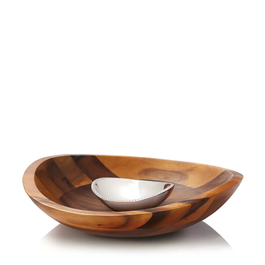Artful coils formed of brightly gleaming chrome decorate this sculptural assortment of serving pieces from Nambé. Richly grained acacia wood lends earthy warmth.