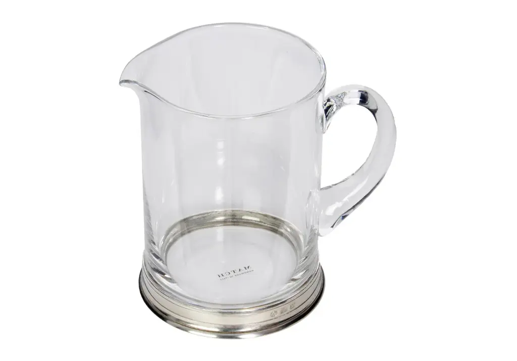 Beautiful and functional, this pitcher lends timeless elegance to any table with its wide, rounded design complemented by a sturdy, curved handle. A round pewter base, handmade in Italy, further elevates its classic look with individual stamps noting the region, workshop, and tin content.