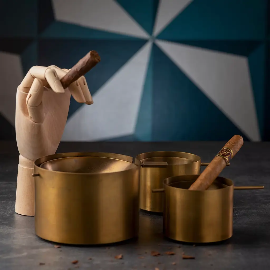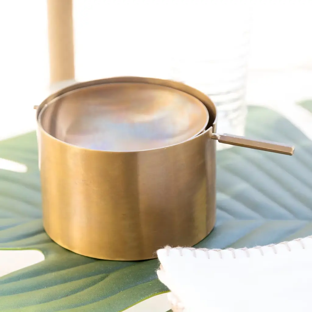 A distinctive design accent to any modern or traditional decor, this ashtray transforms an ordinary object into an exceptional piece of functional decor. Masterfully handcrafted of burnished brass, it features a deep cylindrical shape uniquely enriched with a tilting plate placed on the top. Please contact the Concierge for possible customization options.