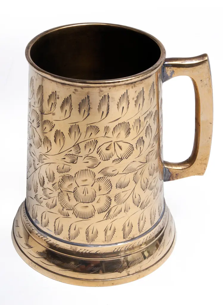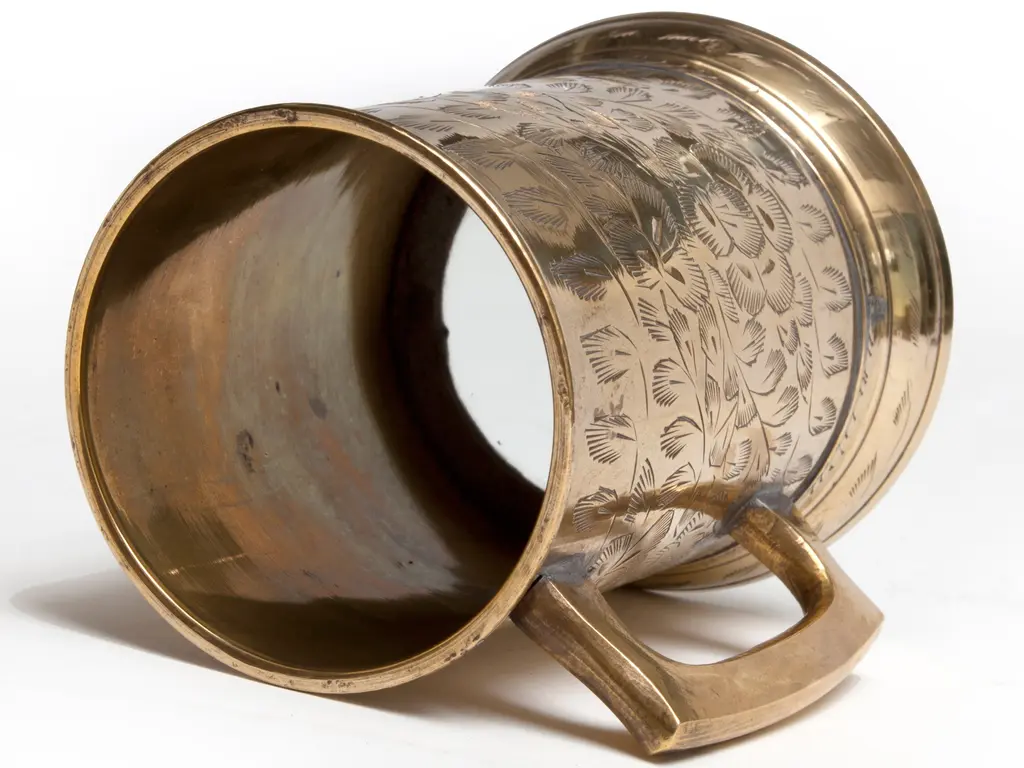 Indian brass mug with glass bottom, engraved with a beautiful floral motif.