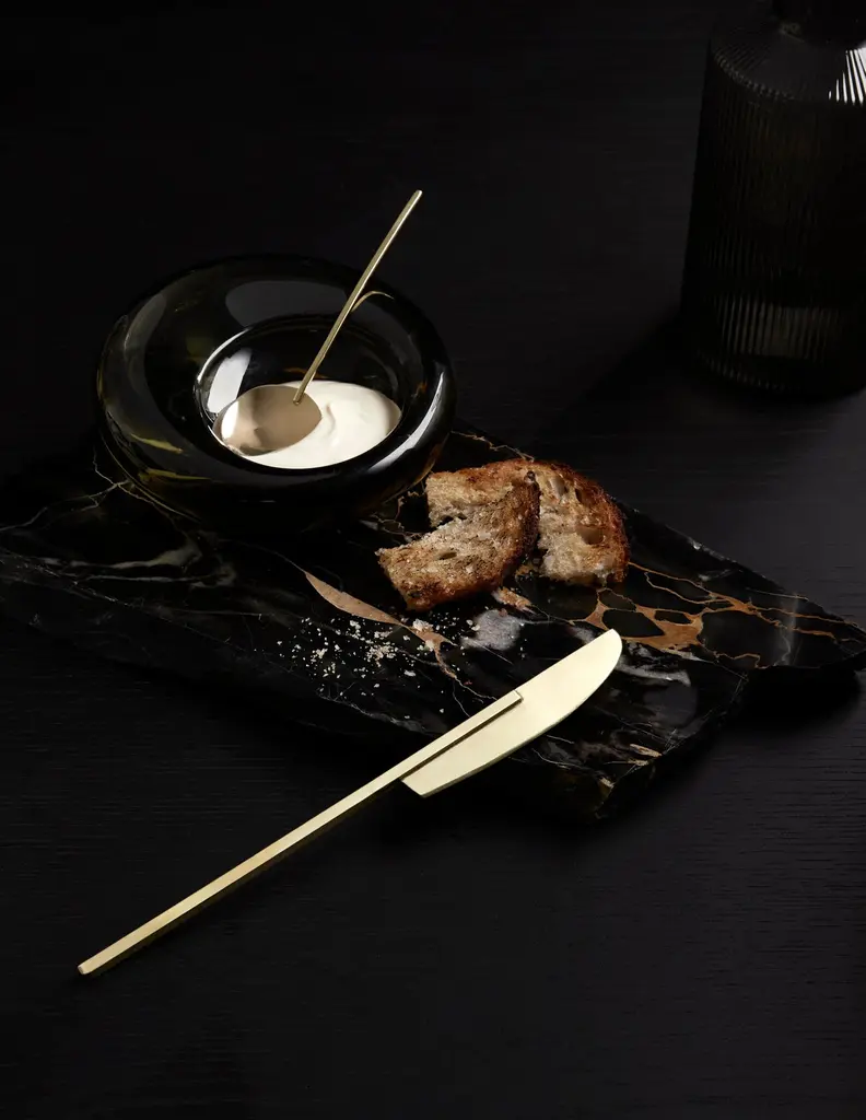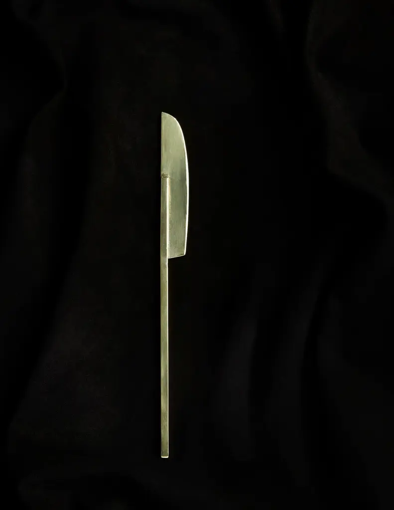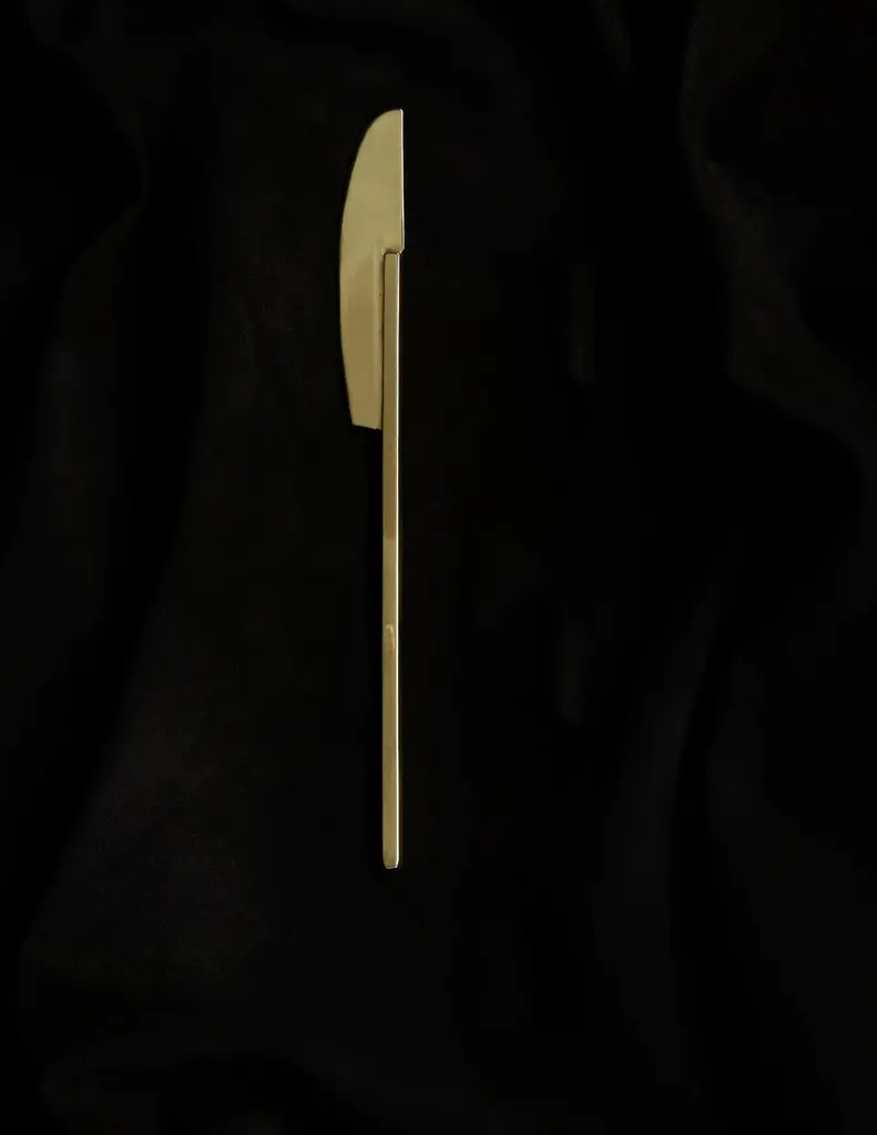 Add a touch of sophistication to your dining experience with this stunning butter knife, expertly crafted by Heath Wagoner at HW. Studio in Brooklyn, NY. The knife's flawless high-polish brass finish, coupled with its meticulous fabrication and forging, make it a true work of art. Each piece is meticulously crafted by hand, cut from brass sheets, soldered, forged, and hand-finished ensuring that no two knives are exactly alike. Experience the perfect blend of form and function with this unique and elegant addition to your dining table.The knife's unique design blends form and function to create a modern update to the butter knife.HW. Studio's work is meant to re-invigorate modern dining while employing jewelry techniques and craft to create objects that are jewelry for dining and for the table.