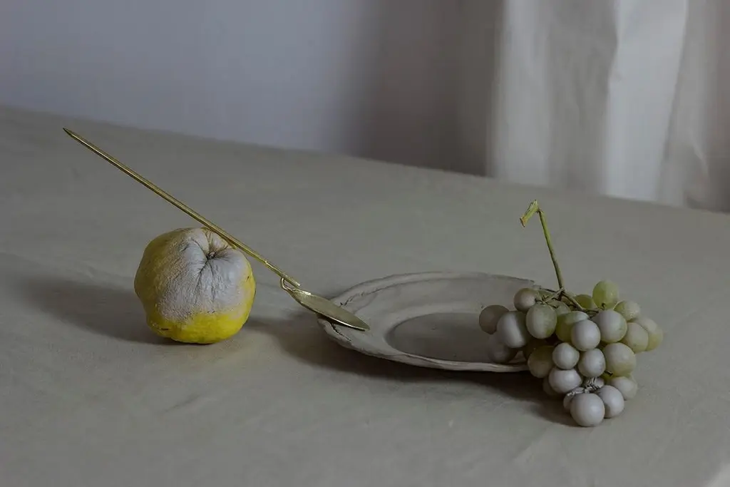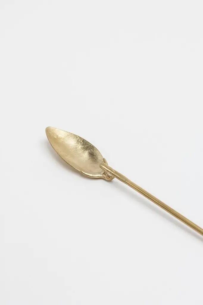Brass "Ligula" spoon - Raquel Vidal and Pedro PazDimensions: 25 x 3cmMaterials: Hand-sculpted brass spoonRaquel Vidal and Pedro Paz Craft pottery and jewelry that seeks to preserve ancient techniques and aesthetics. Their work is defined by a deep respect for materials, metal and clay being the primary raw materials with which they work. Both of these elements have been used since the beginning of humanity to not only make tools and supplies but also for creating objects to contemplate and connect with our bodies and environment. Pottery and jewelry have worked together in each society’s development, mutating and showing the interests, needs and concerns of a given era.Raquel and Pedro believe these ancient arts also help us understand our ancestors, get closer to them and experience how they felt materials and shapes. The material connections between metal and clay are also of interest. Both materials have long and slow production processes and an intimate connection with fire, a somewhat rebel and magic element, that humanity has always craved to control.This belief that materials and the processes applied to them can transform the artist into a restorer of old sensibilities is foundational for Raquel and Pedro. Every piece is crafted slowly and methodically, there is no rushing in the process, and with a respect for the natural worl's own "will" to produce its own results.