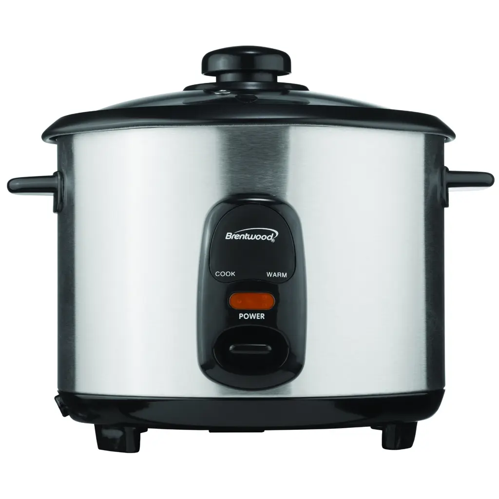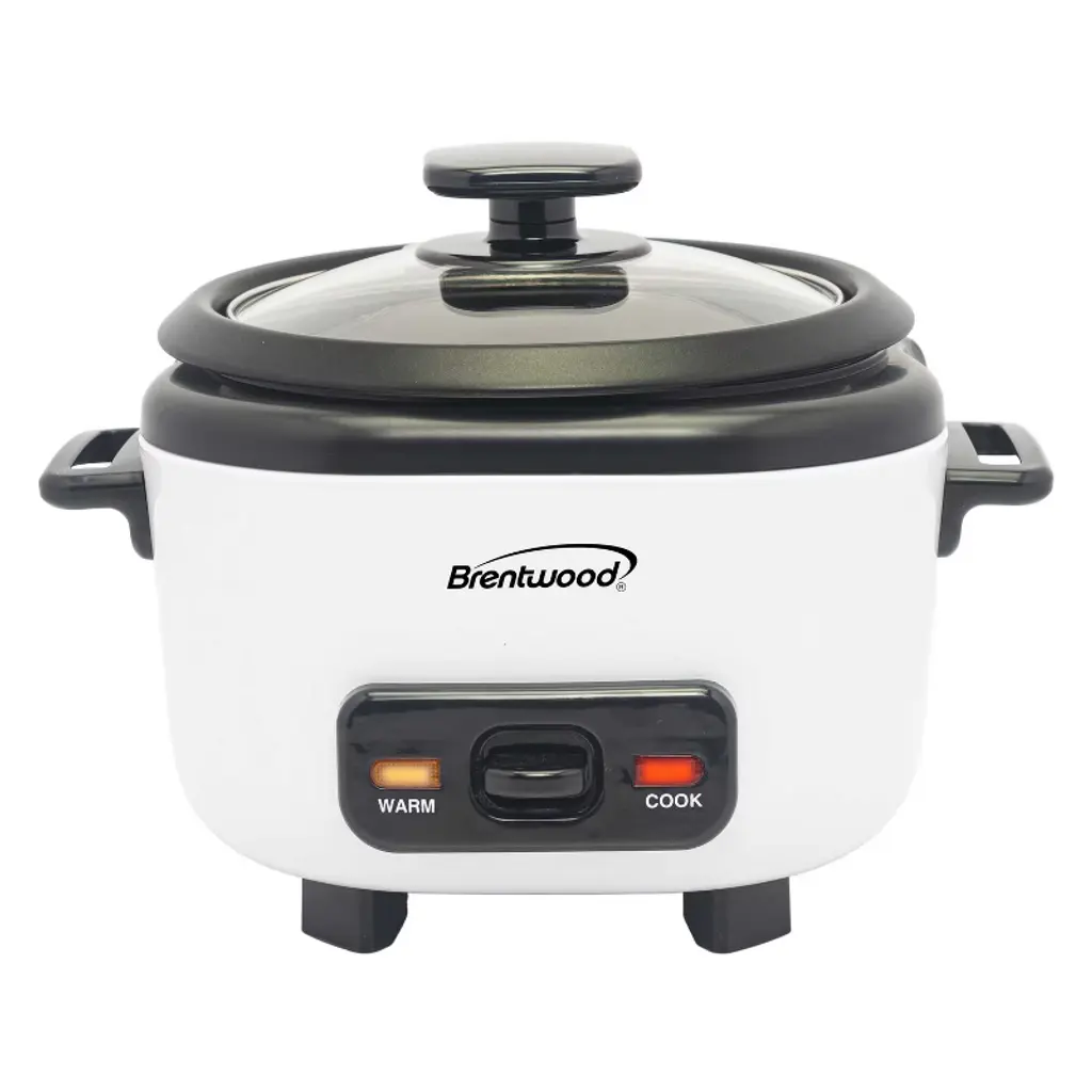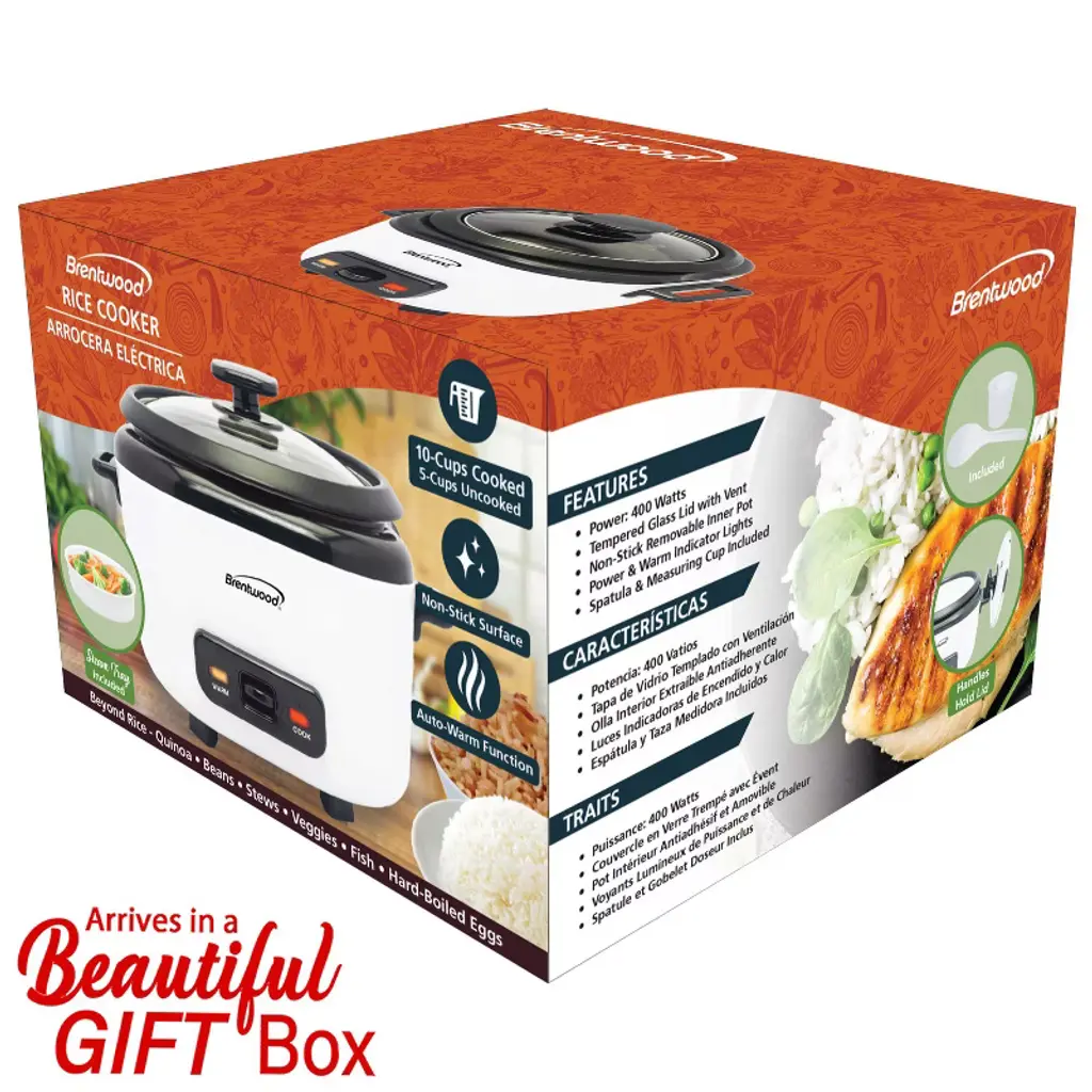 Use the powerful 400-watt Brentwood® 5-Cups Uncooked/10-Cups Cooked Electric Rice Cooker with Measuring Cup and Spatula to steam rice to perfection. You can also heat and enjoy chili, soup, rice pudding, oats, quinoa, and more. Steam fish, dumplings, veggies, and more in the included steam tray. Hassle-free, 1-touch operation switches over to warming once food is cooked. View food through the tempered glass lid. The removable, non-stick pot is made for serving and easy cleaning. Either handle can hold the glass lid while adding or removing rice or other ingredients. A convenient power/warmer indicator light signals when turned on. All you need is your choice of ingredients to start cooking!_