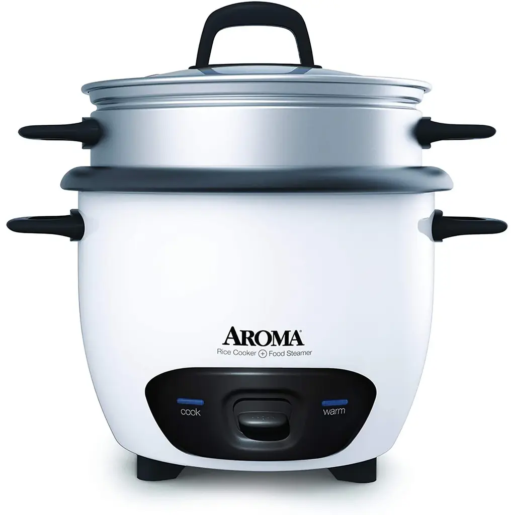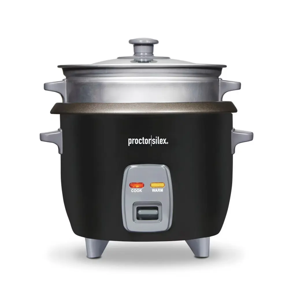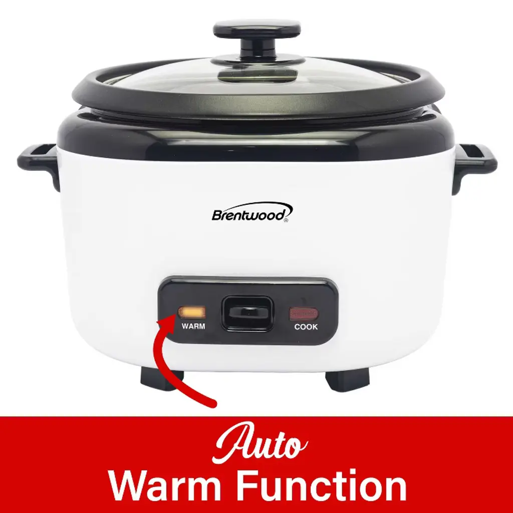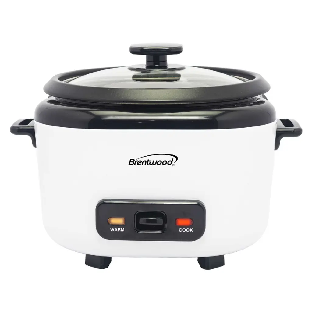 Use the powerful 400-watt Brentwood® 5-Cups Uncooked/10-Cups Cooked Electric Rice Cooker with Measuring Cup and Spatula to steam rice to perfection. You can also heat and enjoy chili, soup, rice pudding, oats, quinoa, and more. Steam fish, dumplings, veggies, and more in the included steam tray. Hassle-free, 1-touch operation switches over to warming once food is cooked. View food through the tempered glass lid. The removable, non-stick pot is made for serving and easy cleaning. Either handle can hold the glass lid while adding or removing rice or other ingredients. A convenient power/warmer indicator light signals when turned on. All you need is your choice of ingredients to start cooking!_