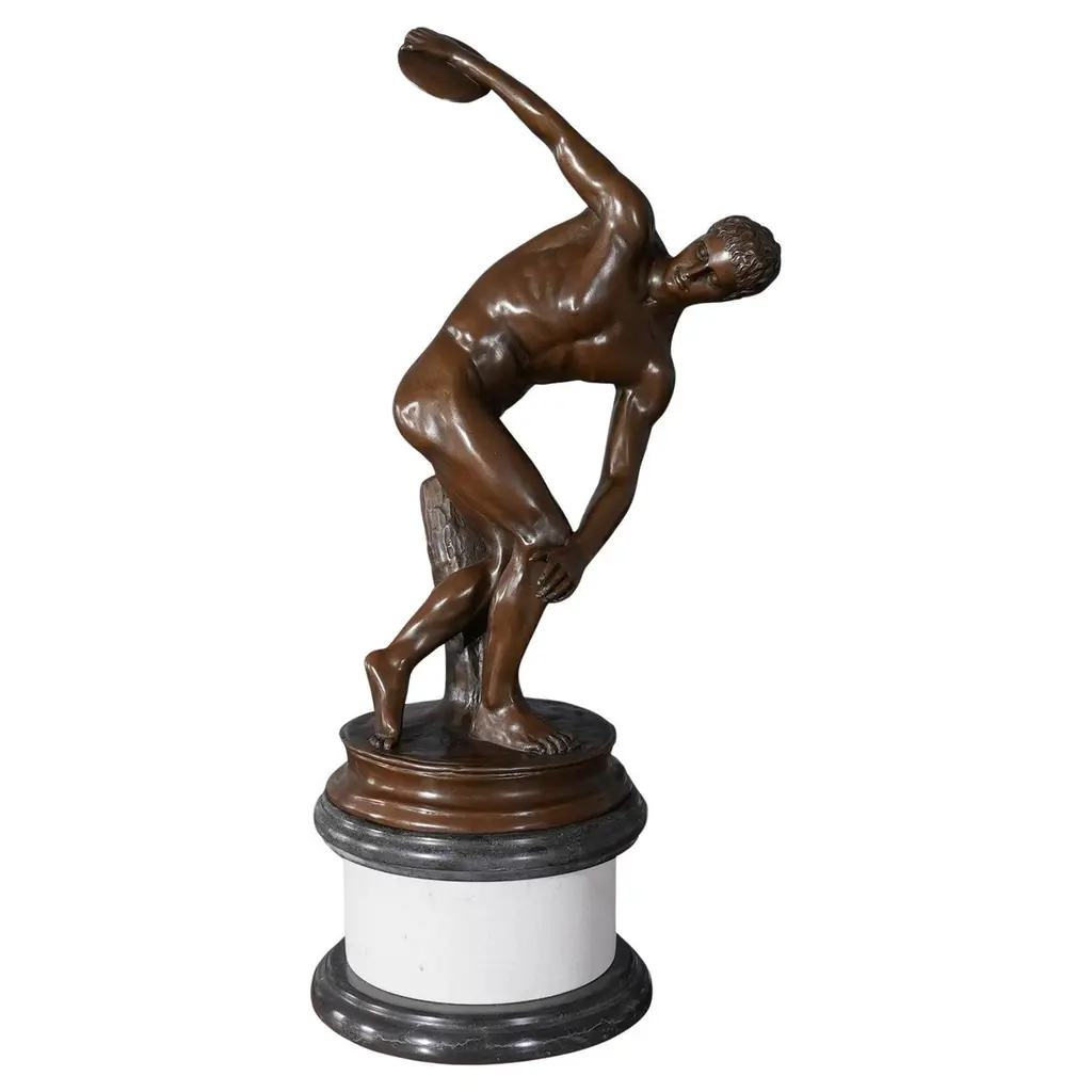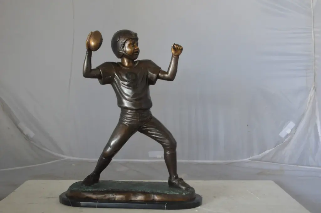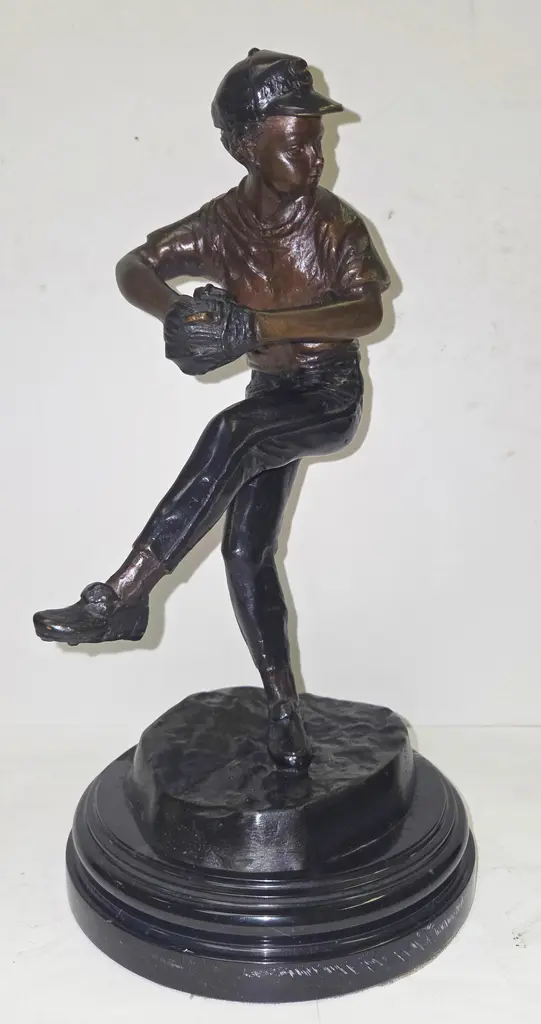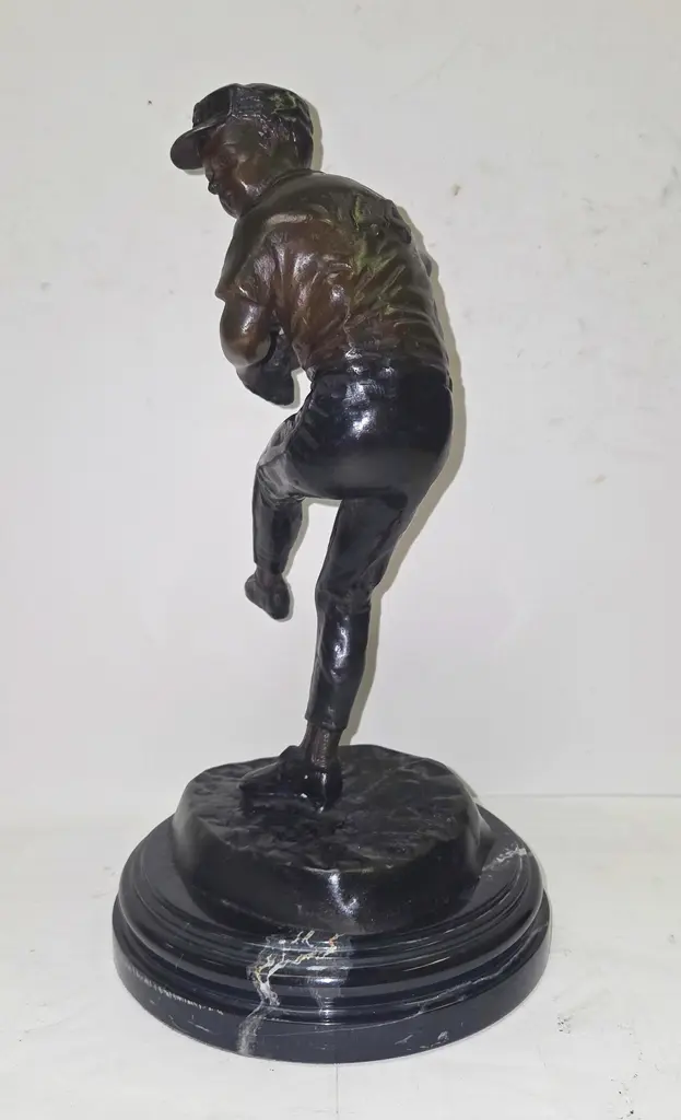 This bronze statue captures the intensity of a baseball pitcher in mid-motion, poised to throw a pitch. Measuring 12 inches tall and 7 inches wide, the piece is finely detailed, from the folds of the uniform to the focused expression on the player’s face. Set on a sturdy round marble base, it has a rich bronze finish that enhances its lifelike presence. A great decorative piece for sports fans, collectors, or as a unique gift for any baseball enthusiast.