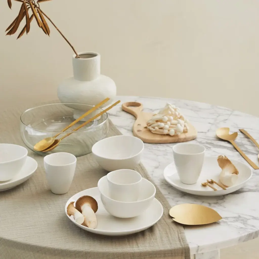 This dinner plate’s organic lines + imperfect shape give it the engaging look of a homemade ceramic piece. It’s crafted from durable stoneware with a simple white finish that lets the distinctive silhouette shine – and acts as a clean backdrop for your creative platings.