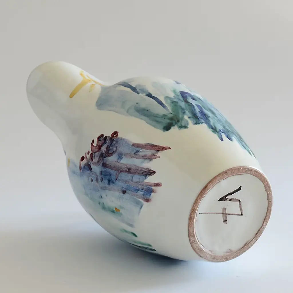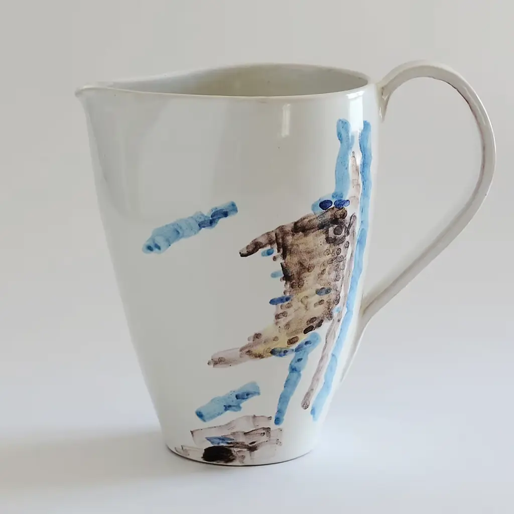 This exquisite ceramic jug was hand made on a lathe and then glazed with a dynamic brush stroke pattern in brown and blue. Due to its hand-crafted nature, reproductions of this piece will be similar but not identical.