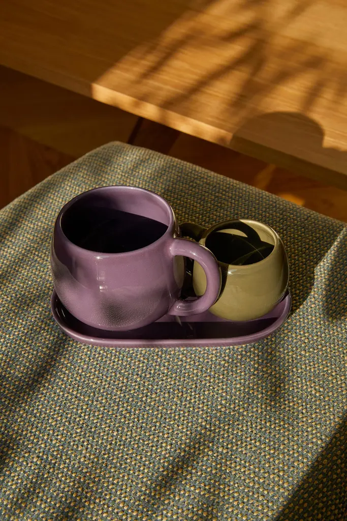 As part of our ceramic breakfast capsule, this mug is both fun and functional. Finished with a high-gloss glaze in shades of purple, brown, and green, it can be used on its own or combined with the matching tray and espresso cup to create a full set. This mix-and-match collection allows you to curate your own set of three items. Made in Portugal.