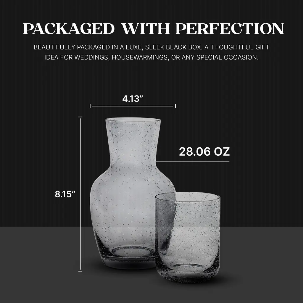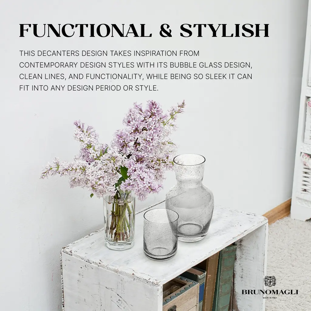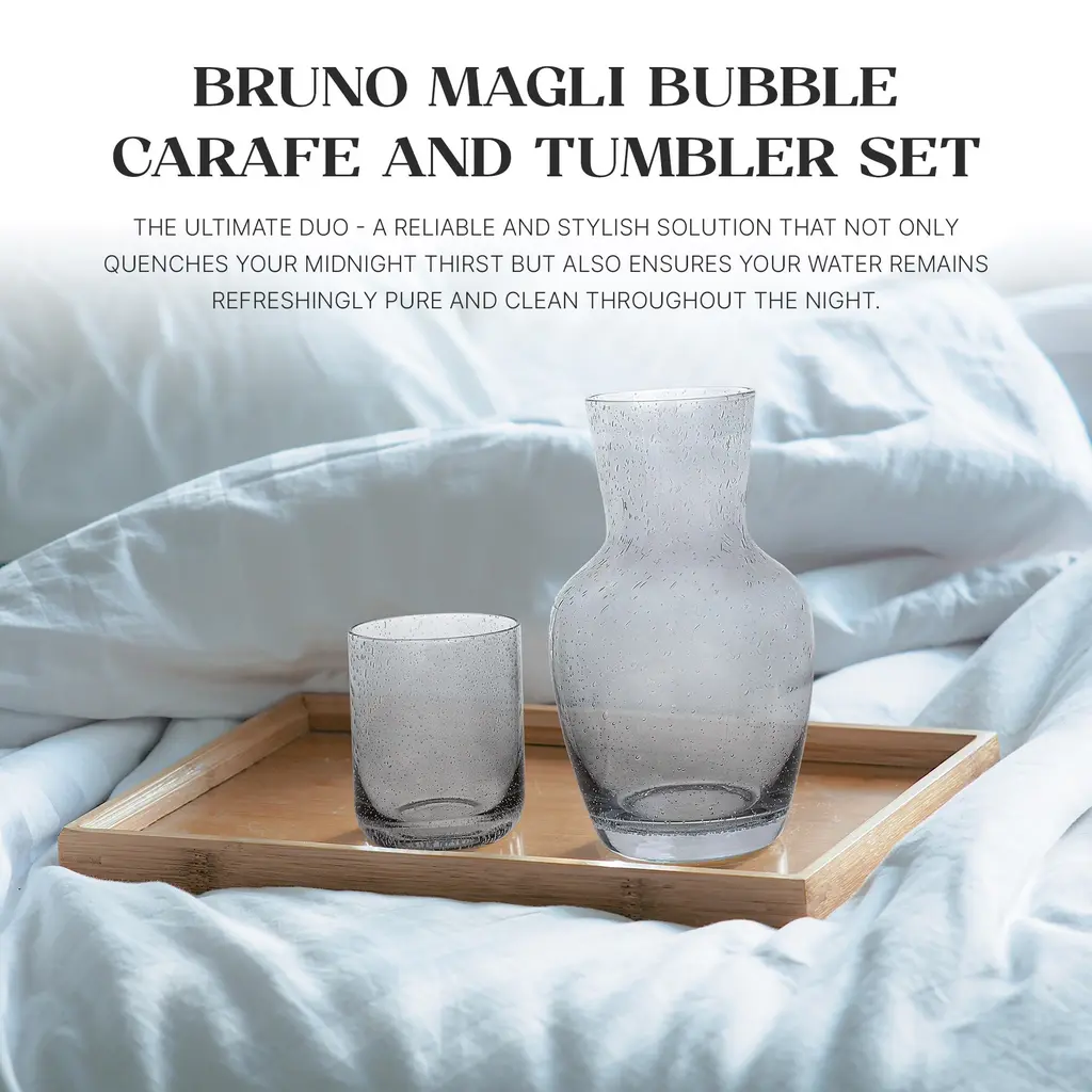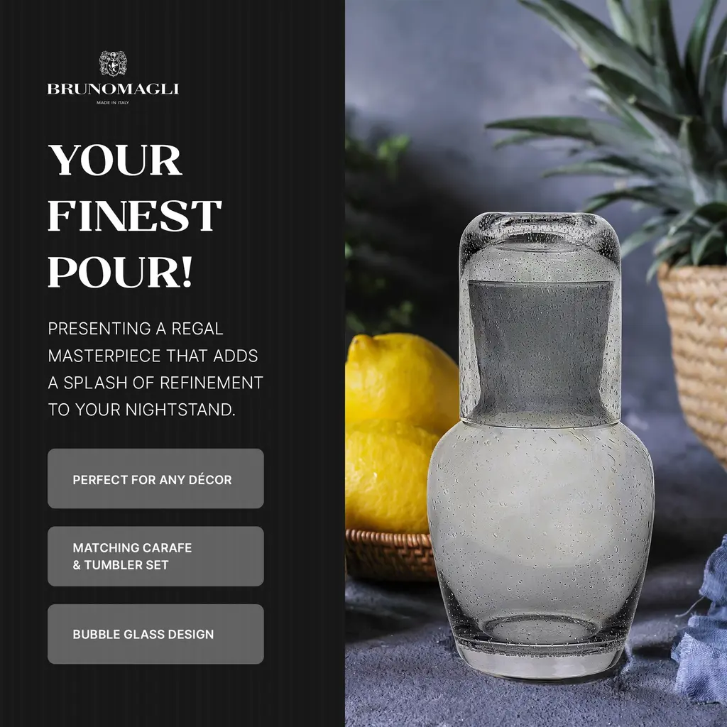 Bruno Magli Bubble Carafe, 2-Pc Set, 28 oz - NewRefillable carafe bottles are the perfect solution to midnight thirst! Just fill up the decanter before you go to bed, cover with the cup, and have fresh water all night long. It makes a great addition to a bedside table for quenching thirst in the middle of the night. Versatile and stylish this bedside carafe with a cup/lid can be used as a wine decanter, water jug, orange juice container, mouthwash dispenser, or mimosas pitcher. Perfect for weddings, housewarmings and other special occasions, this carafe is boxed in a luxe, sleek, black gift box. This bubble glass bottle drinking carafe is the perfect luxury good for gifting for anyone who enjoys the finer things in life. It offers a luxury feel anywhere it’s displayed in the house. Bruno Magli 80 years of Italian heritage: Since its inception, Bruno Magli has created refined, handcrafted footwear for those who appreciate elegant design and impeccable craftsmanship. Today Bruno Magli continues to evolve its heritage by reinventing luxury essentials for a new generation.FEATURES:MATERIAL:WHAT'S IN THE BOX:PACKAGING: Retail Packaging
