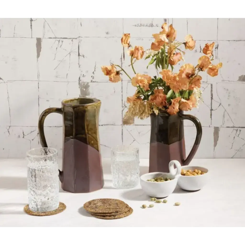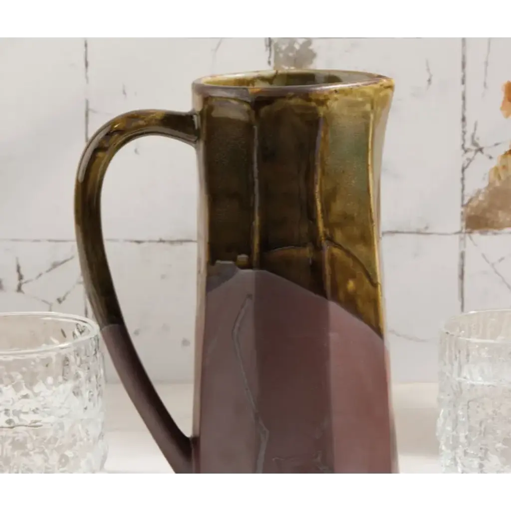 Finish: Metallic Green/Bronze Material: Stoneware The Bryce stoneware pitcher is sculpted with faceted sides, a swooping handle, as we as contrasting matte bronze and luster mossy glaze. Blue Pheasant's products are handmade with care by artisans using natural materials. They are not mass produced, so variation between products should be expected, and this is why we love them! It is these irregularities that makes Blue Pheasant what it is—a special brand whose collections are distinctly handmade, full of charm and originality you’ll never find in machine-made products.