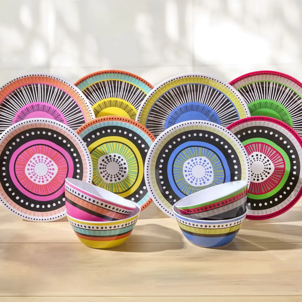 Add vibrant colors to your dining table setting with this eclectic kitchenware. This durable melamine set includes four: 10.5" dinner plates, 9" dessert plates, and 6" bowls.