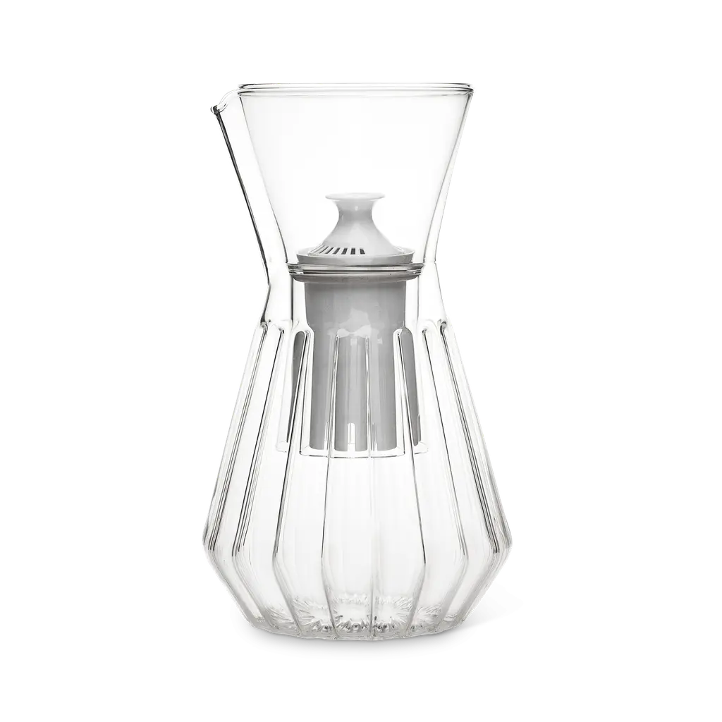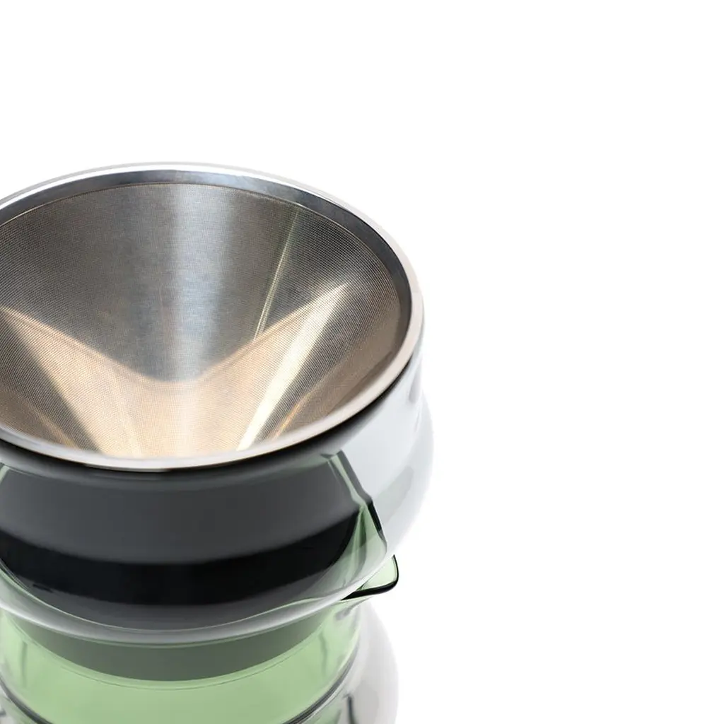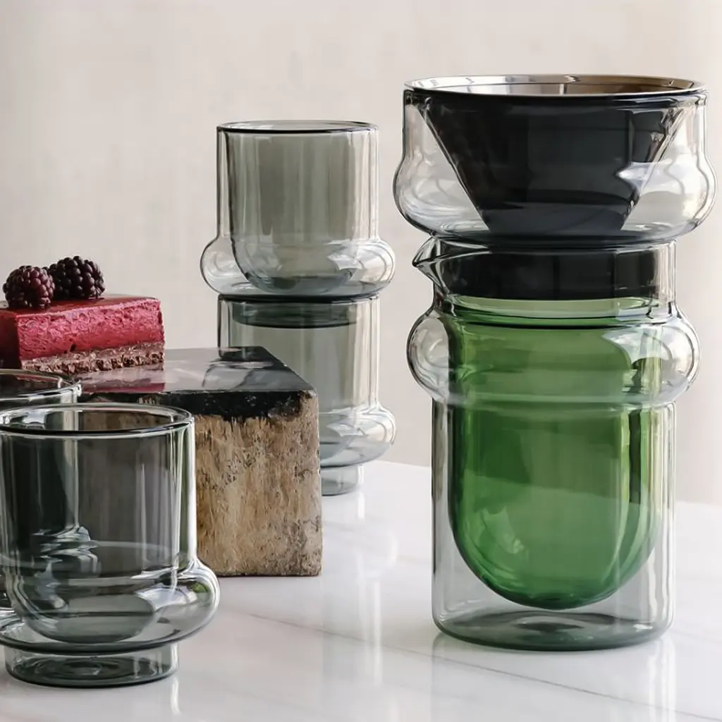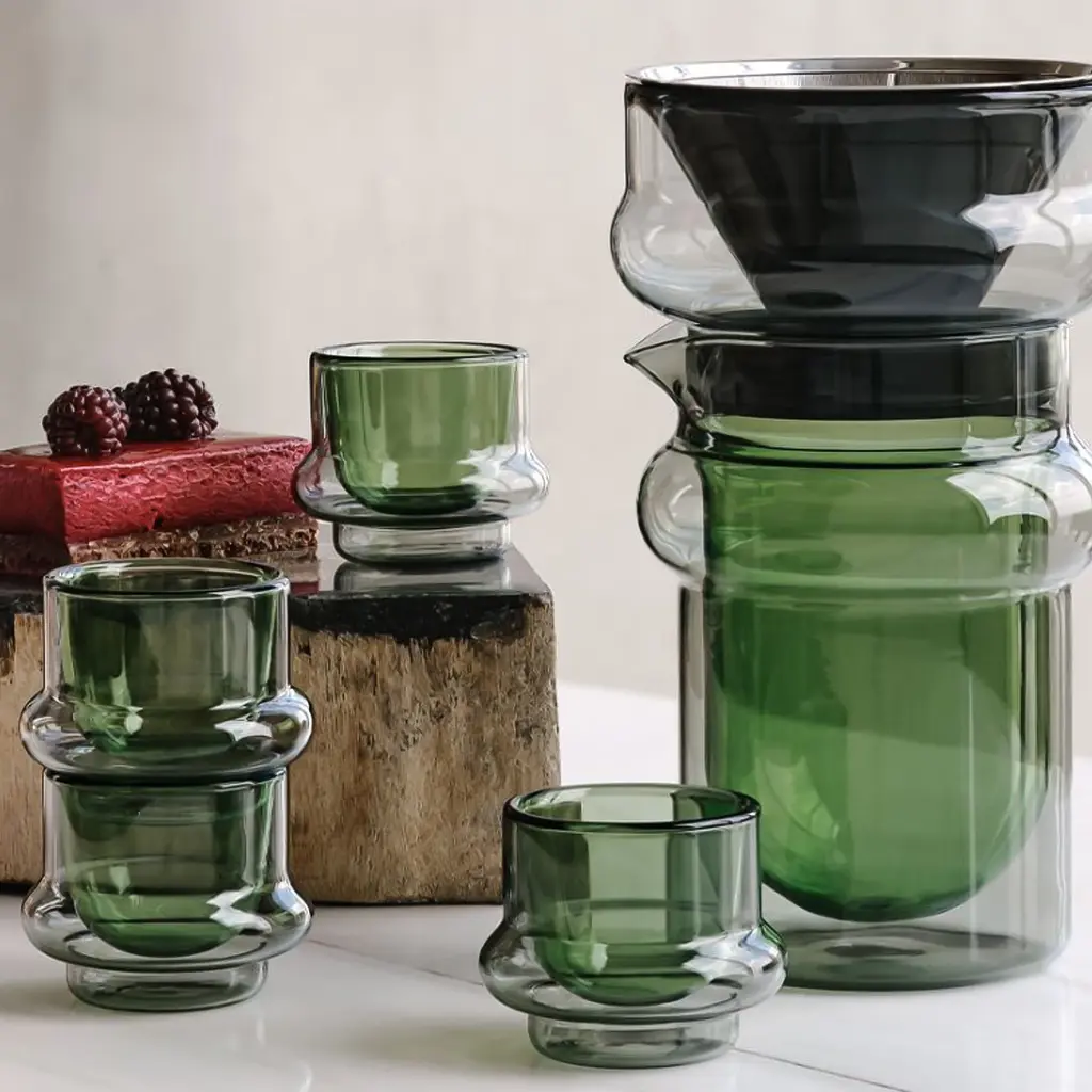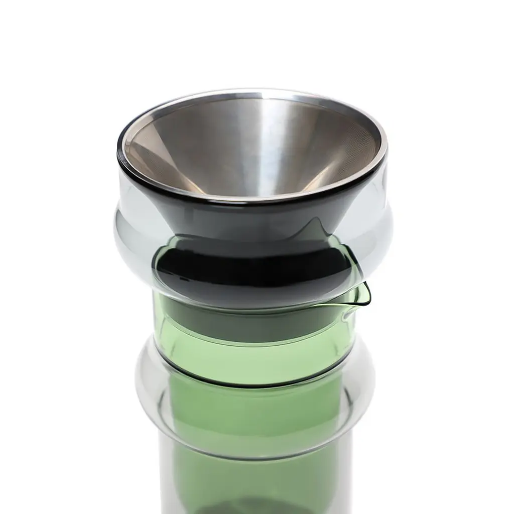 Introducing BUMP Coffee: a carafe with a built-in filter, designed with minimalist aesthetics and crafted from high-quality borosilicate glass. This piece, part of the acclaimed BUMP collection, is carefully handmade to reveal subtle hues of green and grey, bringing a refined elegance to your daily coffee ritual.
