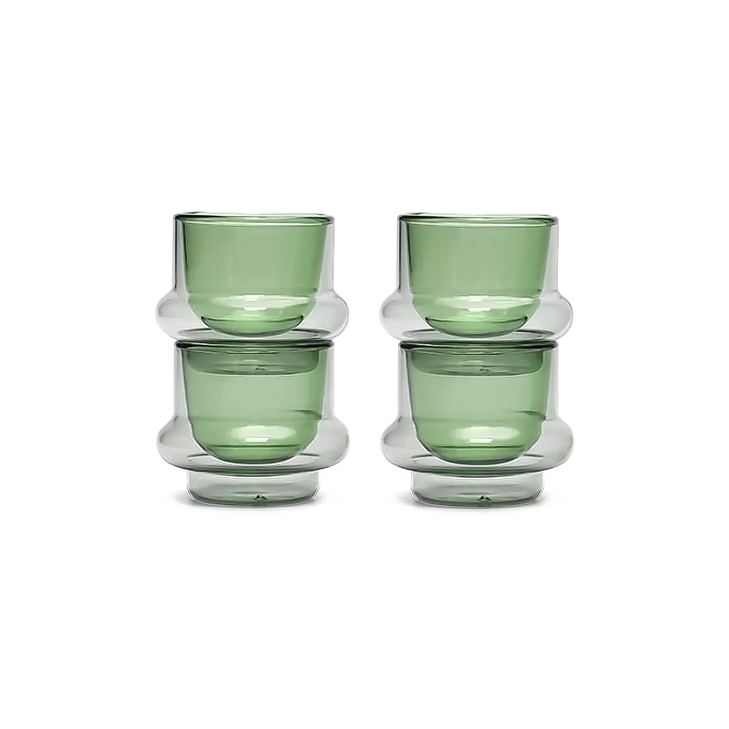 The Bump Espresso Cup Set features a set of four minimalist espresso cups, crafted from premium borosilicate glass. Handmade with subtle green and grey hues, each cup has a 50ml capacity, double-walled design, and natural thermal shock resistance for a refined coffee ritual.