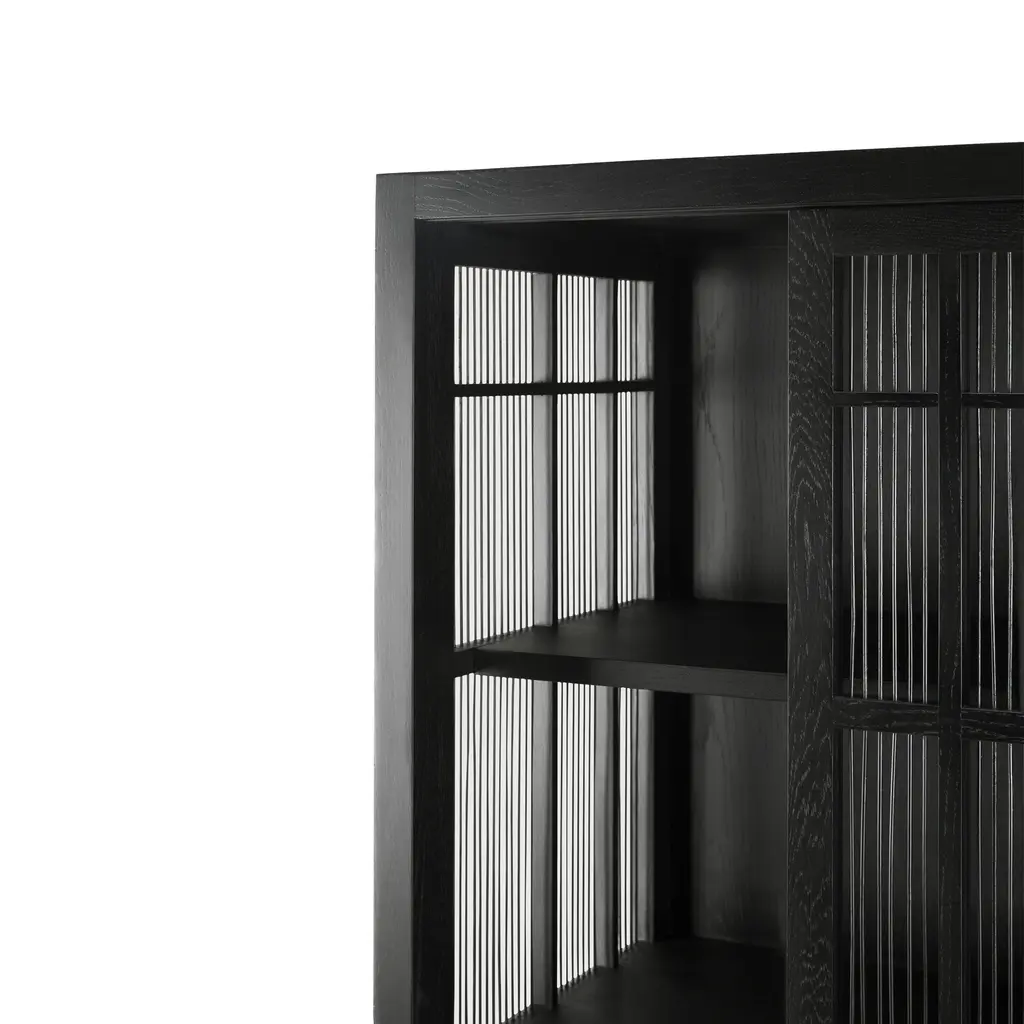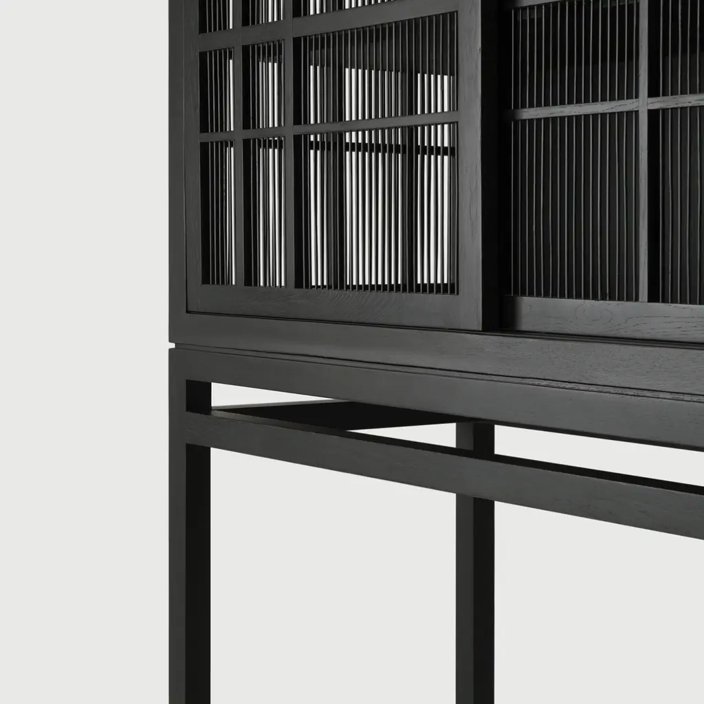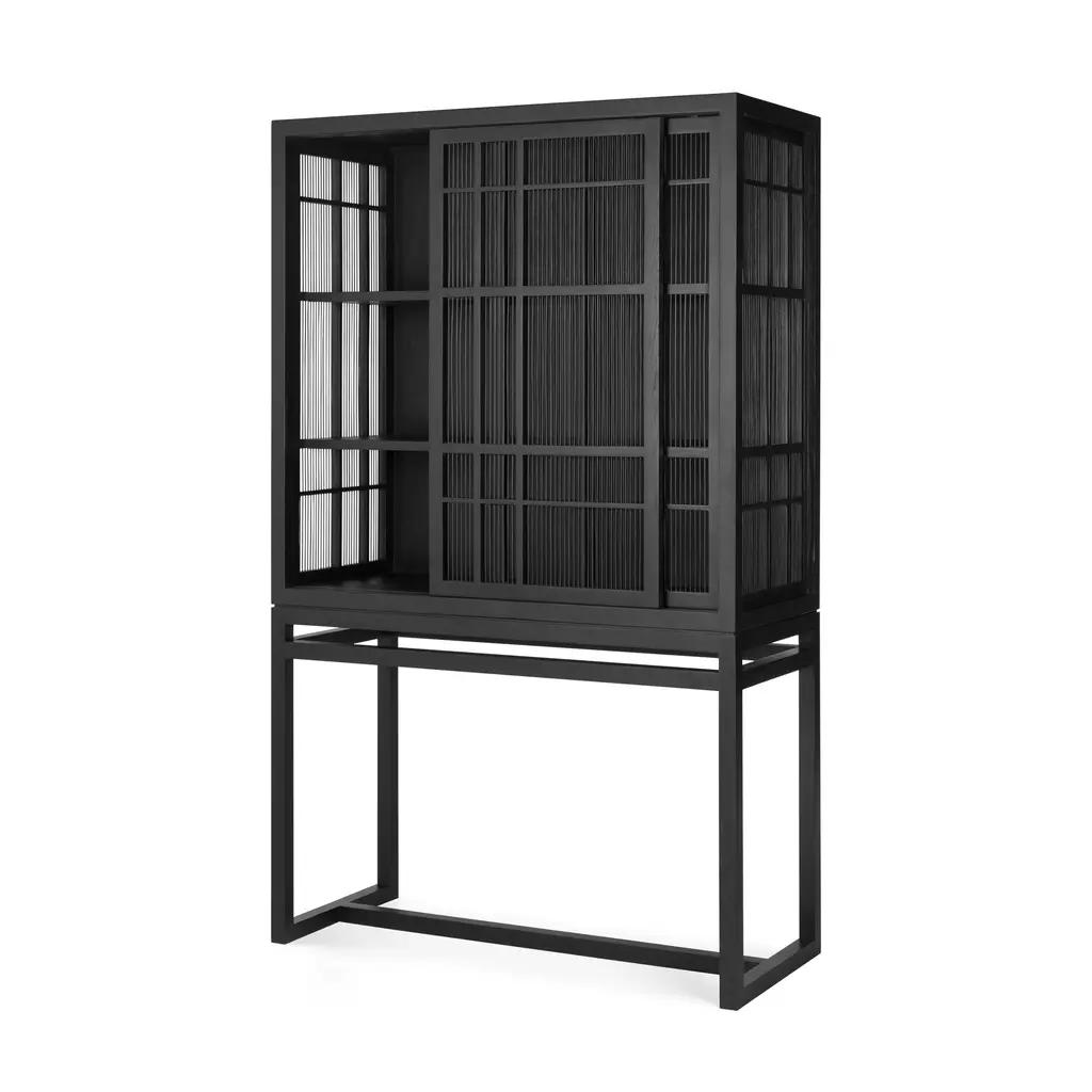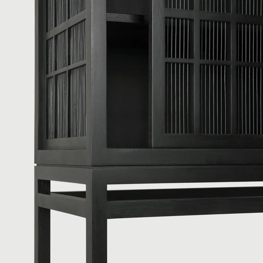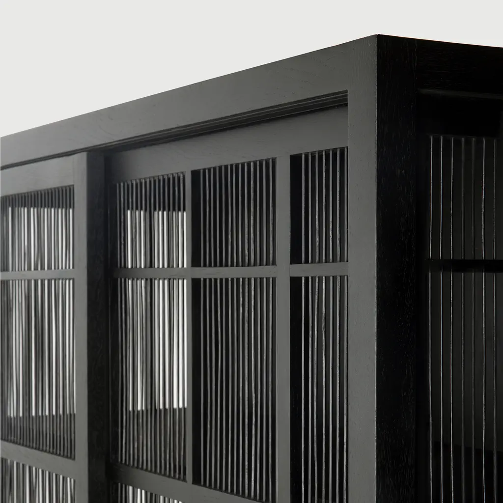 Upgrade your home’s level of refinement with the Burung kitchen storage cabinet black from the Ethnicraft collection. Designed by Carlos Baladia, this storage cupboard is as elegant as it is practical. Made from solid oak, it features bamboo spokes on the doors and sides that create a semi-transparent look. As a result, you can easily see the contents at a glance, making this kitchen storage cabinet black perfect for your best china, designer glassware, and other items you want to keep proudly on display. Furthermore, the cabinet also works well in a living room or dining area. Two sliding doors glide open to offer access to the interior, which features three spacious storage shelves. Made from black-tainted oak and bamboo wood with a varnished finish, the Ethnicraft Burung cupboard looks gorgeous in any décor.