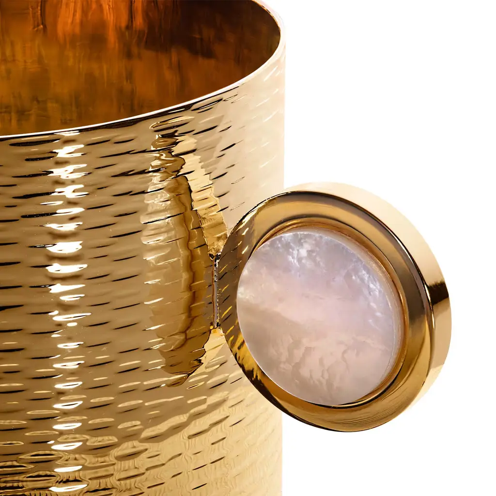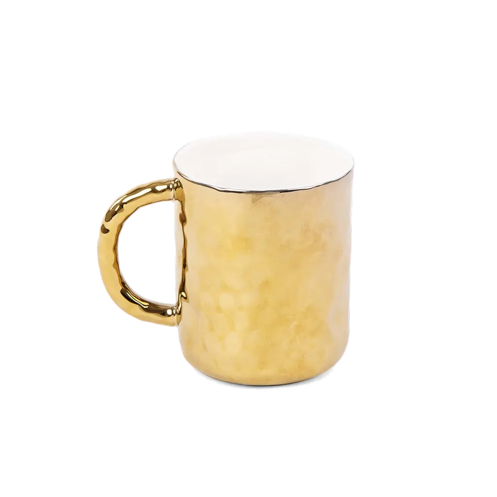 Geometric volumes of contemporary elegance meet luxurious finishes in this superb golden brass tea cup with a matching saucer. Entirely crafted by hand, the set flaunts minutely hammered detailing contrasting with the smooth interior for a touch of textural dynamism that can be appreciated both by sight and touch. A tiny nacre insert embellishes the round handle, proving that beauty resides in the smallest of details.