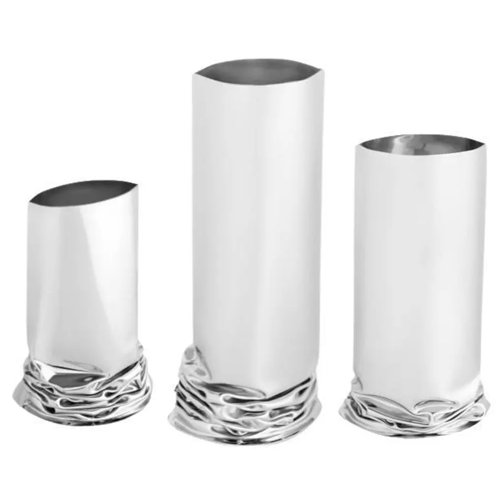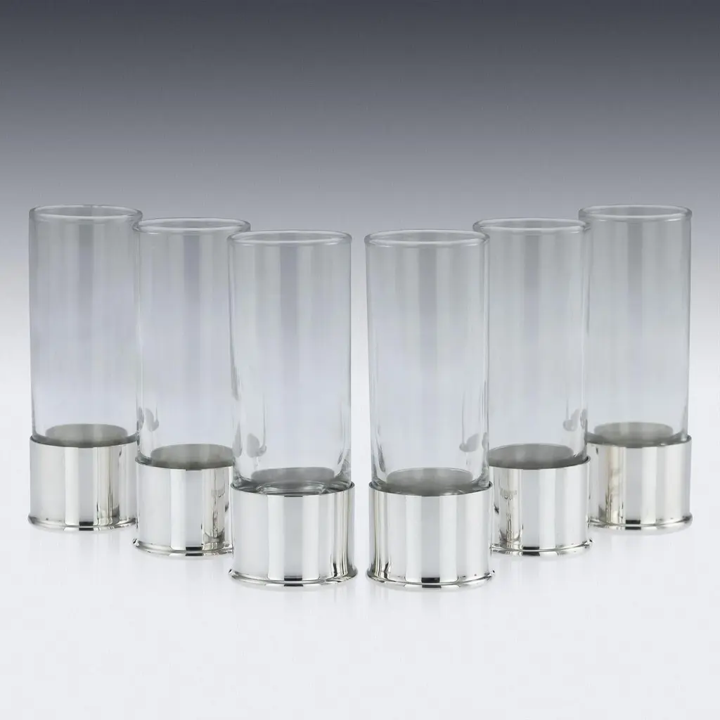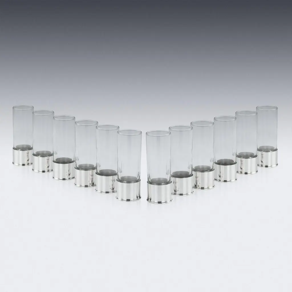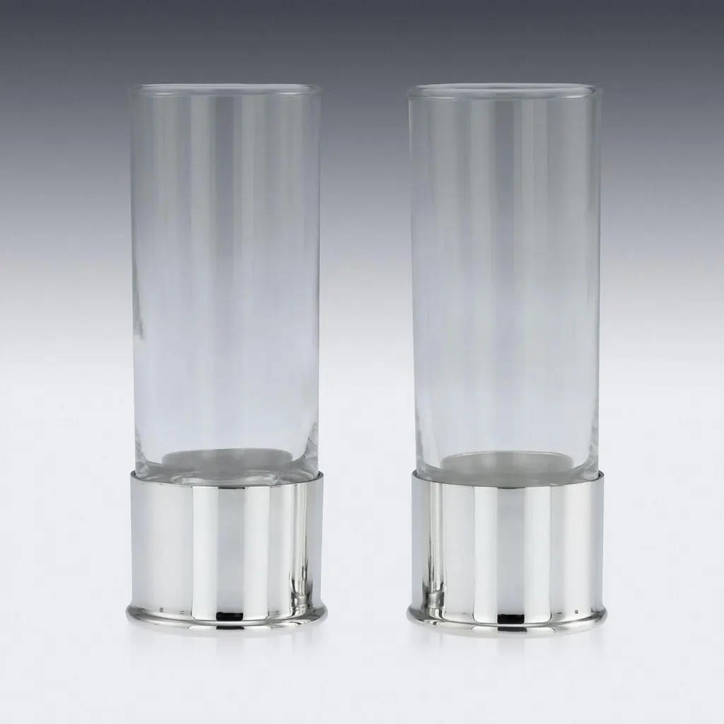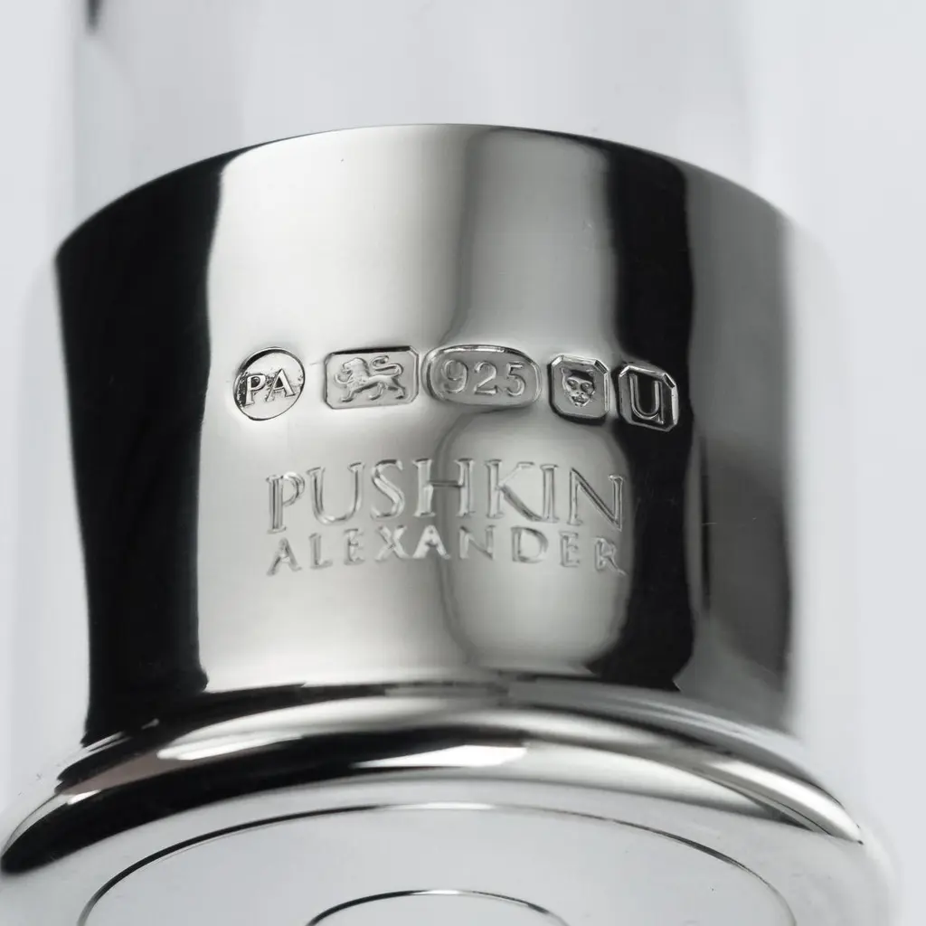 Novelty solid silver butt marker shot glasses imitating a very large hunting shell cartridge, designed in two sections, a solid silver base and fitted shot glass. A perfect set to use by a group of friends before a shoot. The bases can be engraved with numbers 1-12 to use as shooting butt marker, so that each gunman can randomly pick a shot glass denoting their shooting position.Handmade by G J Dennis Ltd (Greg & John Dennis, Maddox street, Mayfair) exclusively for Pushkin Alexander signature range. This renowned Silversmith & Goldsmiths company has made and restored important pieces for the Prince of Bahrain, Royal households and countless celebrities. Each part is fully Hallmarked English silver (925 standard), London, year 2019 (u), Maker PA (Pushkin Alexander, Pushkin Antiques Ltd of Mayfair, London)Condition:NewSize:Height 10.5cmWidth 4cmWeight 150g.