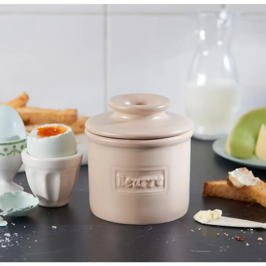Bring neutral elegance to your kitchen with the Café Matte Beige Butter Bell® Crock. Featuring raised butter and beurre lettering, this ceramic butter keeper balances café charm with a soft matte finish for a clean, modern aesthetic. Using the authentic French water-seal method, it keeps butter soft, fresh, and spreadable without refrigeration. Pack the lid with one stick of softened butter, add cool water to the base, and enjoy butter at the ready. The matte beige finish makes this crock a versatile accent for any kitchen décor. Crafted from high-quality ceramic with a glazed interior, it is dishwasher safe for easy care. Its clean, modern look makes it a versatile gift for weddings, new homes, or anyone who appreciates timeless kitchen essentials.