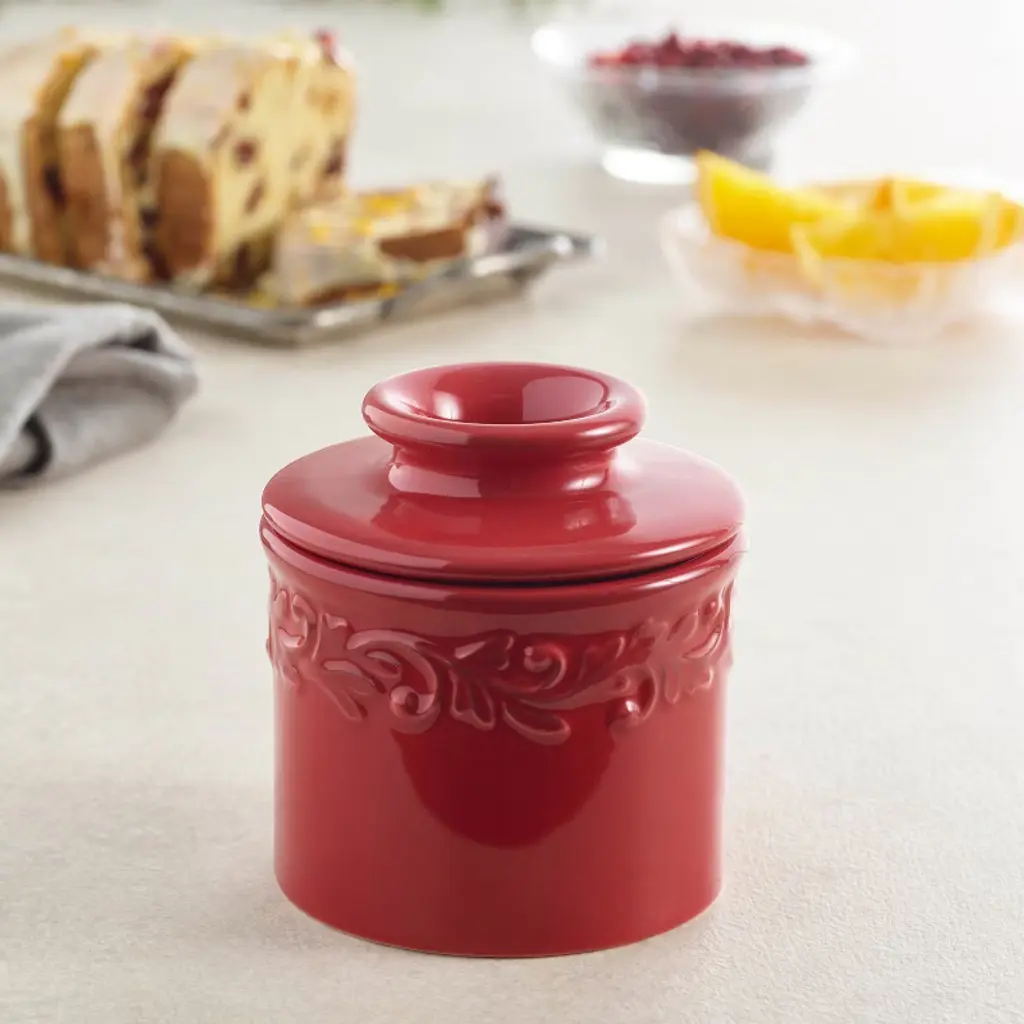 Infuse your kitchen with warmth and charm with the Rouge Antique Butter Bell® Crock. The vintage-inspired French design uses the traditional water-seal method to keep butter soft, fresh, and effortlessly spreadable — no refrigeration needed. Pack the lid with one stick of softened butter, add cool water to the base, and enjoy days of perfectly preserved butter. The rich rouge red glaze and antique finish make this crock a standout piece on any countertop or dining table. Made from durable ceramic with a smooth glazed interior, it holds one stick of butter and is dishwasher safe for convenience. A beautiful and practical piece that also makes a thoughtful gift for weddings, housewarmings, or holiday celebrations.