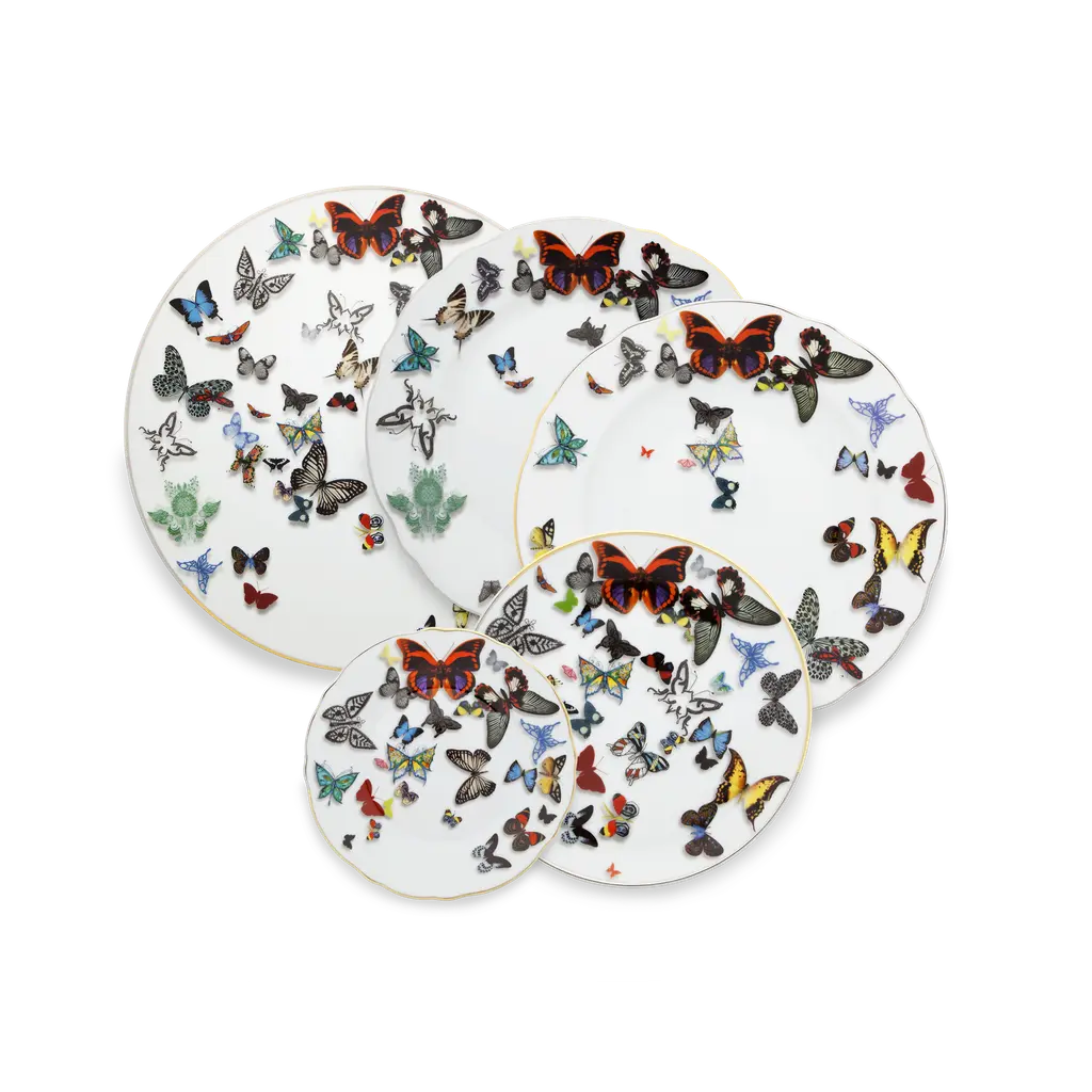 The whimsical and kinetic butterfly pattern of Vista Alegre x Christian Lacroix's Butterfly Parade Dinnerware depicts a parade of real and fantasy butterflies in flight, creating a 3-D effect; 24K gold and platinum borders add an opulent, refined touch.