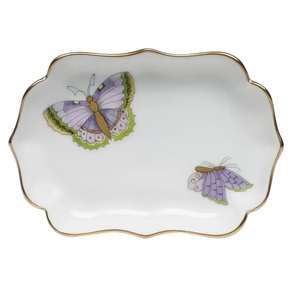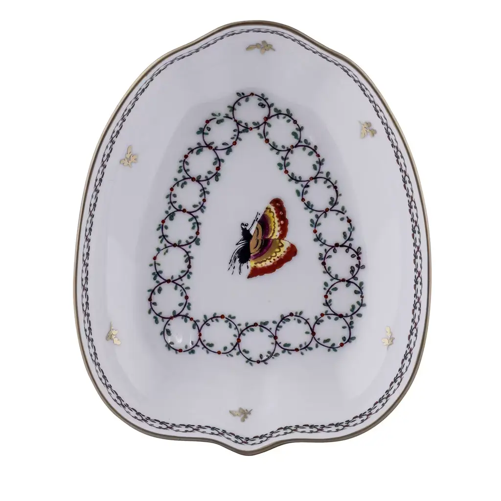 Chinese export for the West was often a riot of color and fantastic animal images. This platter was created by Mottahedeh "in the spirit" of existing style.The Butterfly platter and shell dish feature matte burnished gold and accent flowers. A favorite with brides, Mottahedeh specializes in luxurious patterns and unique, elegant shapes that are reproduced from china found in museums and historical societies. The patterns feature complex and vibrant colors, and hand-painted gold decoration. The pieces are surprisingly fresh and timely, and look wonderful in both contemporary and traditional dining rooms.