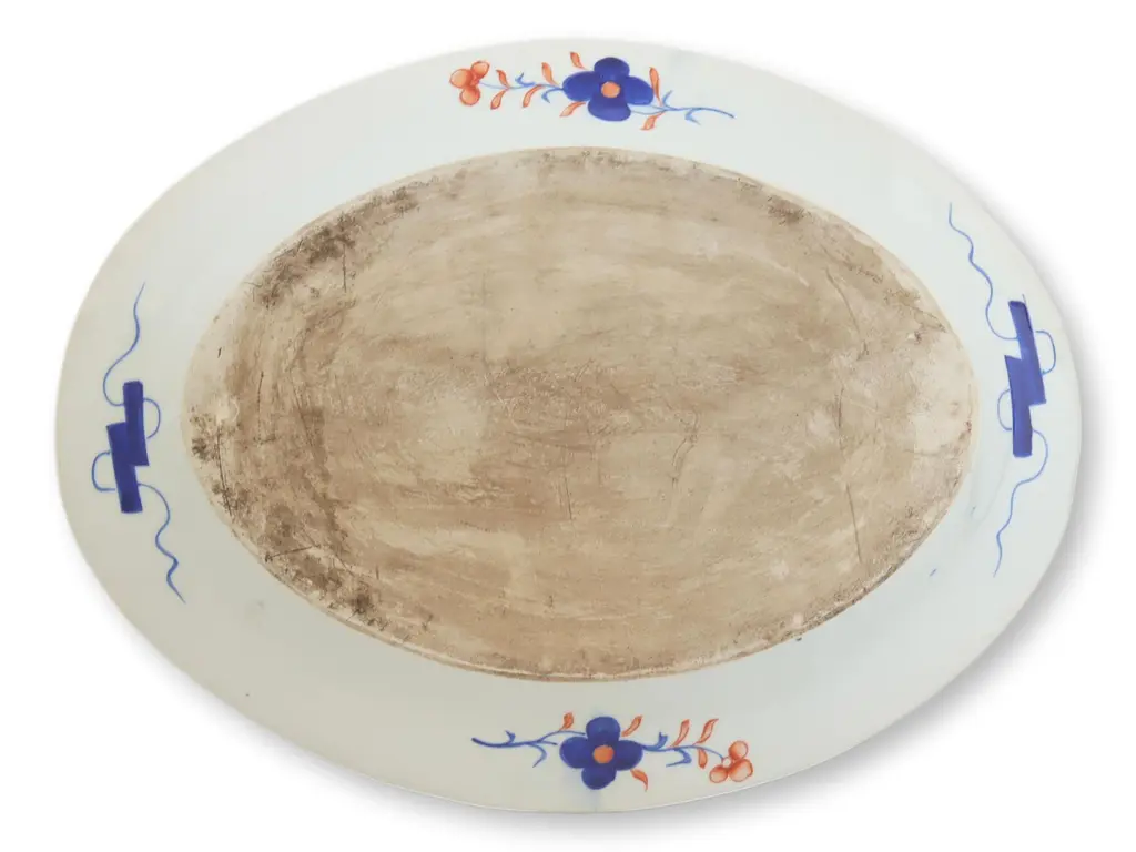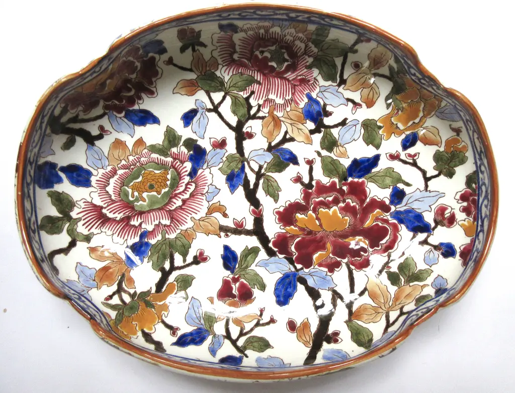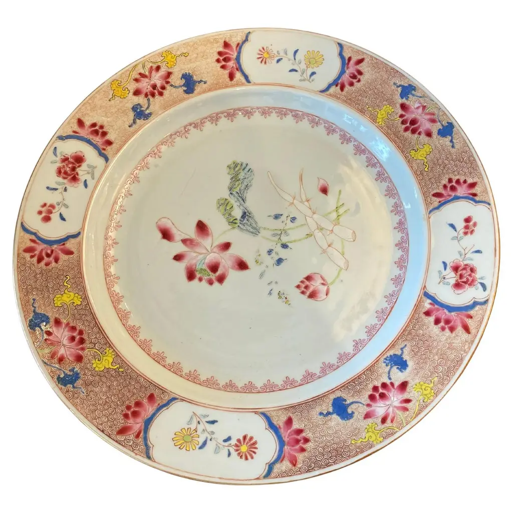 Antique Chinese Quing Dynasty porcelain platter painted in vivid Famille rose enamels in classic Tobacco Leaf Style. Made circa 1770, Tobacco Leaf, was one of the most prized of Chinese Export patterns. Painted with a colorful and warm spring scene of tobacco blossoms and overlapping arrangements of tobacco leaves. This pattern has been reproduced over the years, this is an original piece. As would be expected for this type of pottery, there is not a maker's mark.