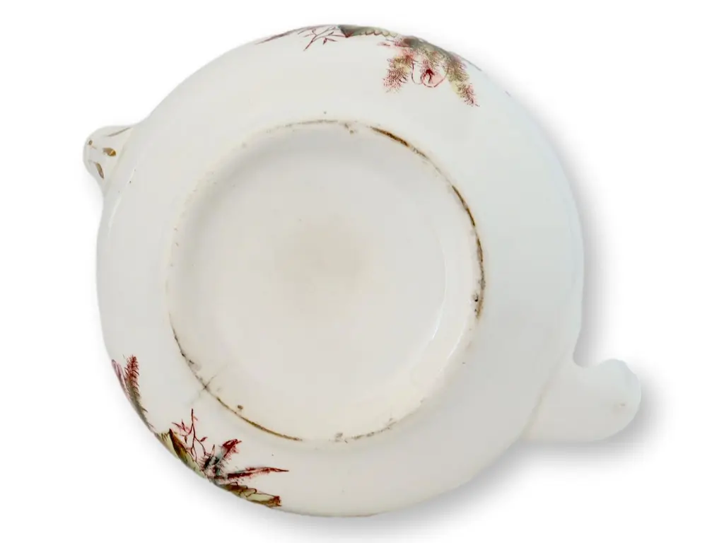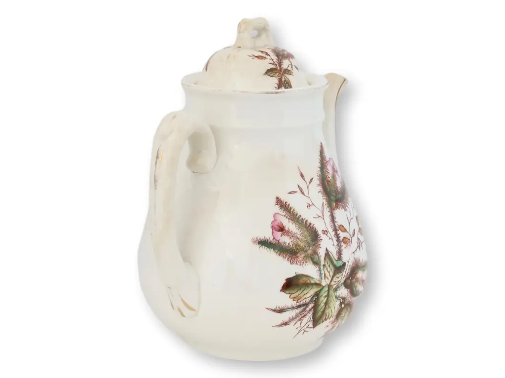 From the 1880s, this tea pot boasts the intricate Moss Rose pattern, a timeless motif cherished for its delicate design. Holding up to 12 cups, it’s as functional as it is decorative, crafted to serve large gatherings while offering a glimpse into the artistry of the late 19th century. Signed on bottom.