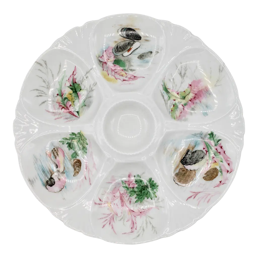 Immerse yourself in the rich artistry of late 19th-century France with this stunning Digoin Sarreguemines majolica oyster plate. A marvel of design and craftsmanship, the plate features six deep blue-lined wells, thoughtfully arranged upon a verdant bed of green seaweed. At its heart lies a brown starfish, serving as a central sauce well. Whether showcased in a collection or gracing the table at your next dinner party, this piece promises to be a timeless beacon of French artistry. Unsigned.