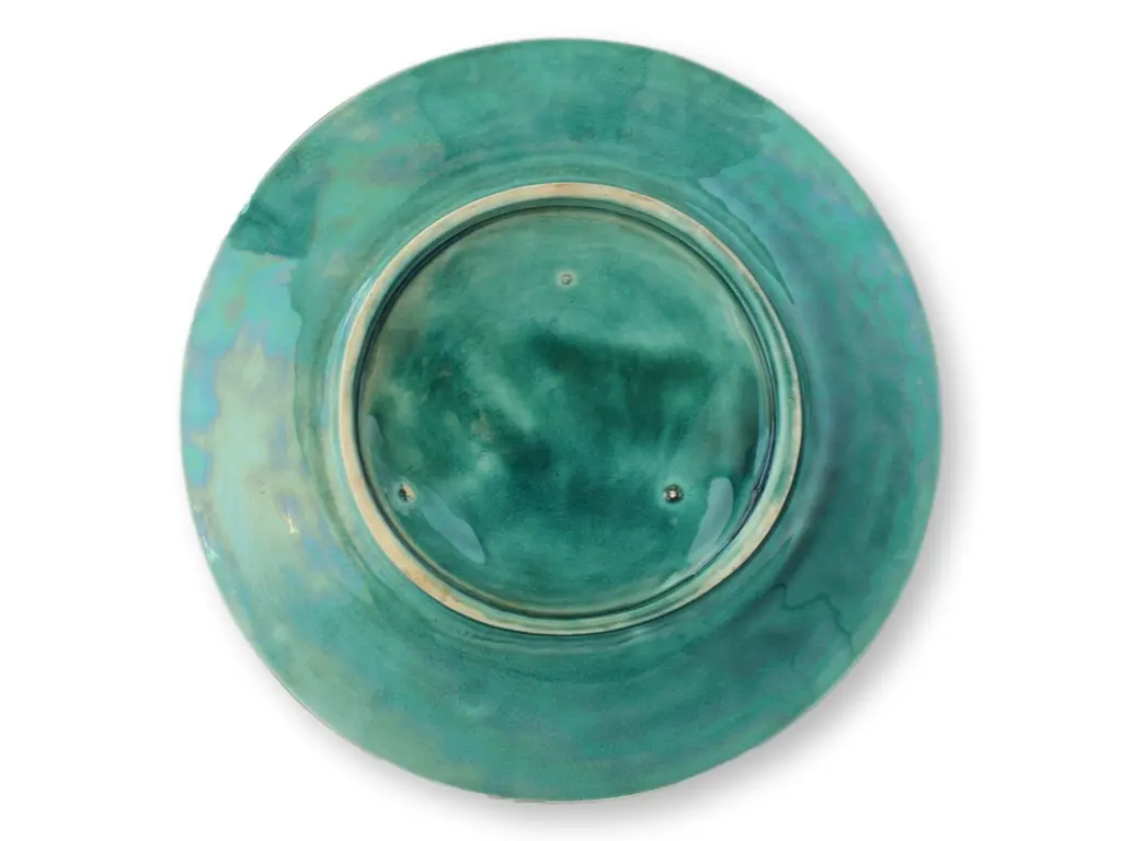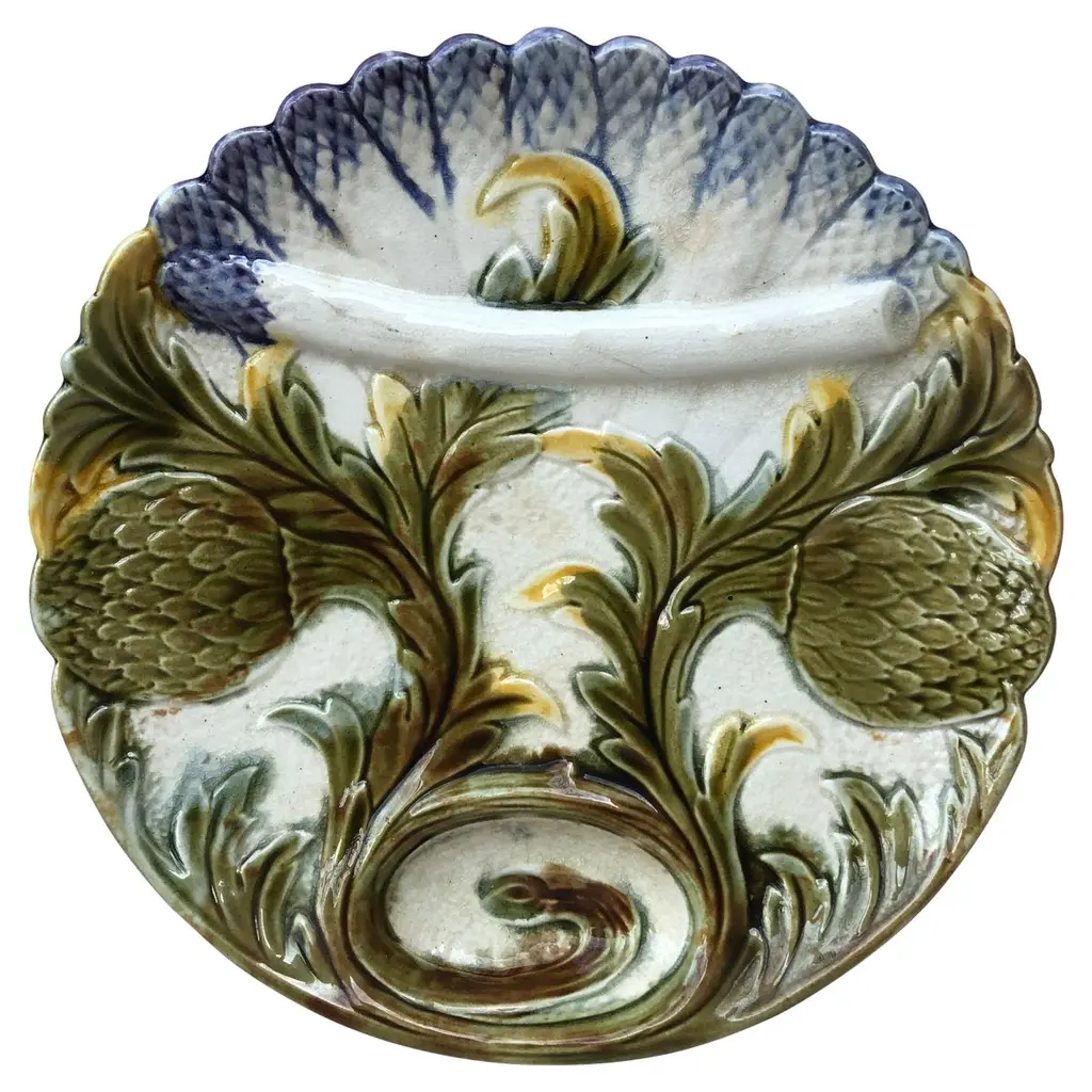 This French Majolica Asparagus and Artichoke Plate, crafted circa 1890, features a beautifully detailed and colorful depiction of asparagus spears and artichokes, framed by rich foliage. The raised patterns and vibrant glaze are characteristic of fine French Majolica craftsmanship from the period. A true collector's piece, this plate is perfect for display or use, adding a touch of antique elegance to any home or Majolica collection.