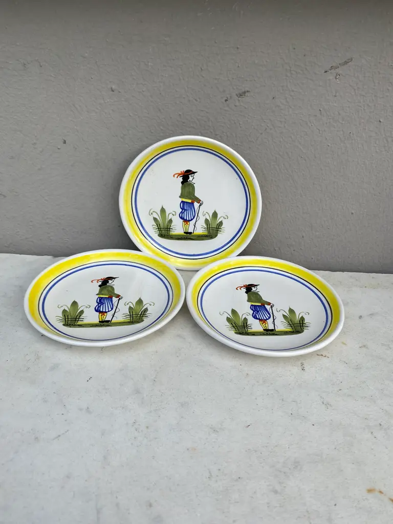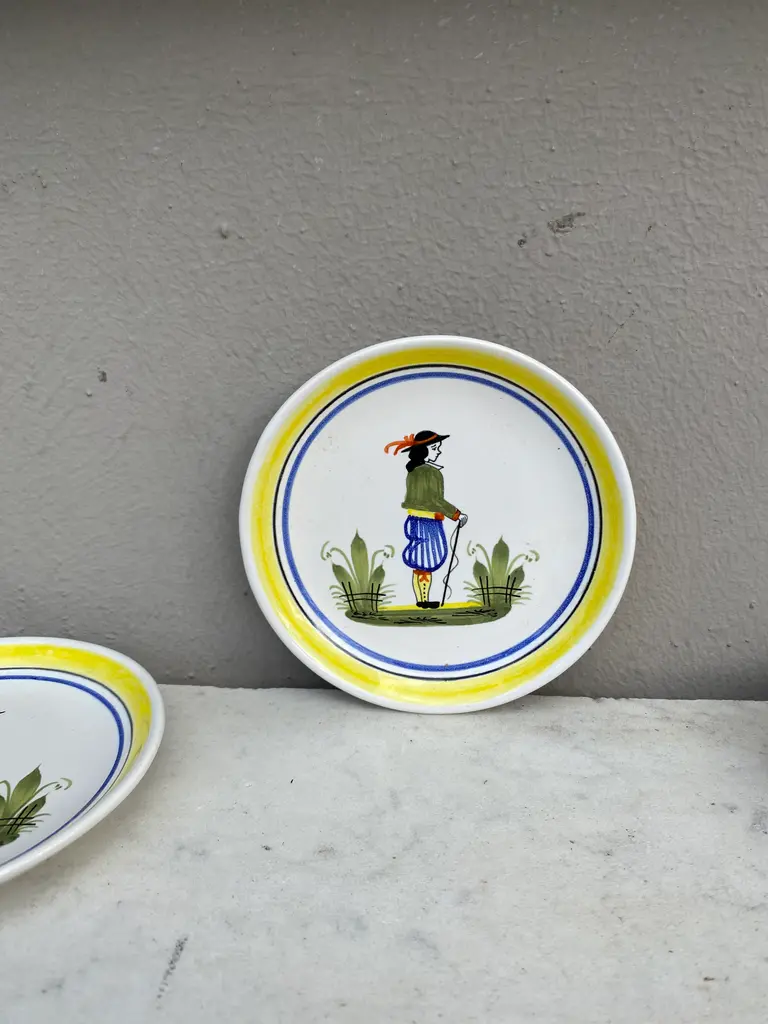 French Miniature Henriot Quimper Plate signed circa 1950. A breton man is represented on the center with a yellow border.