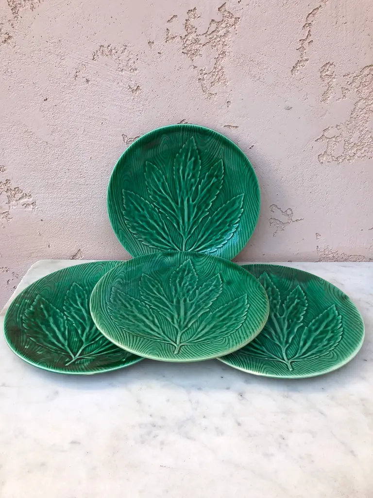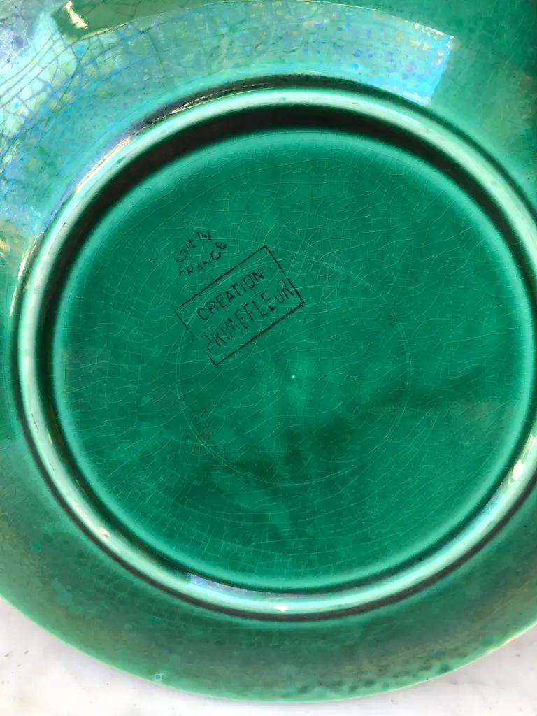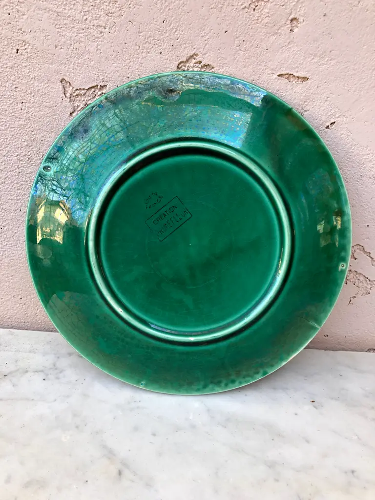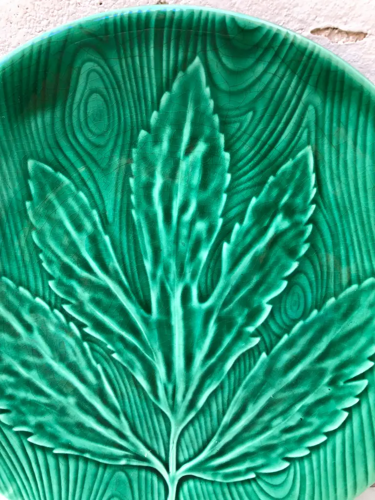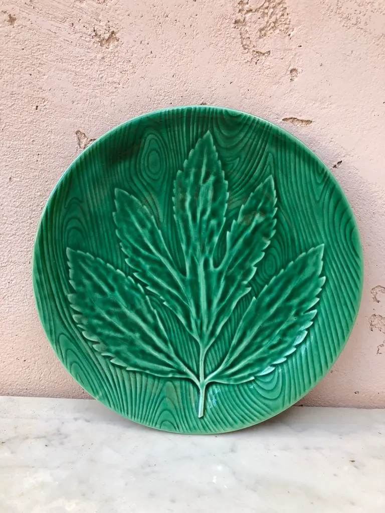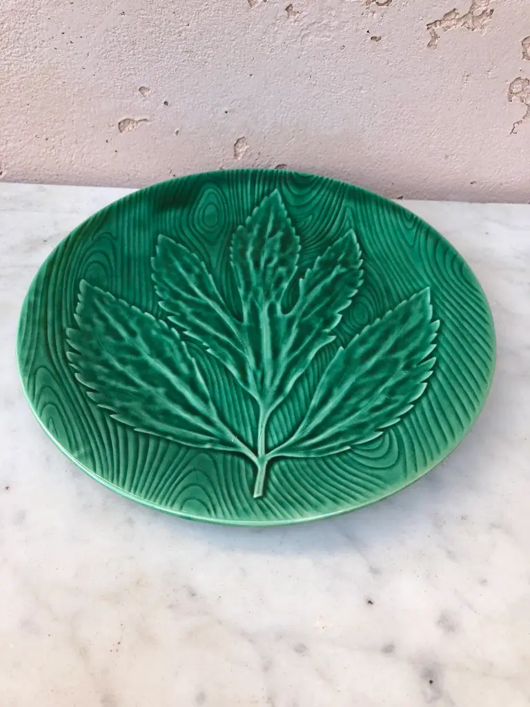 Green Majolica Leaf Plate signed Gien Primefleur Circa 1950.