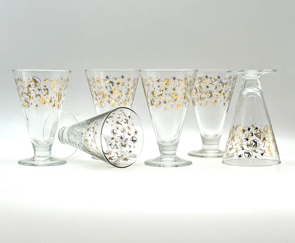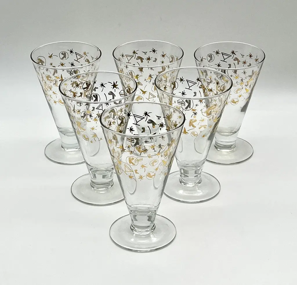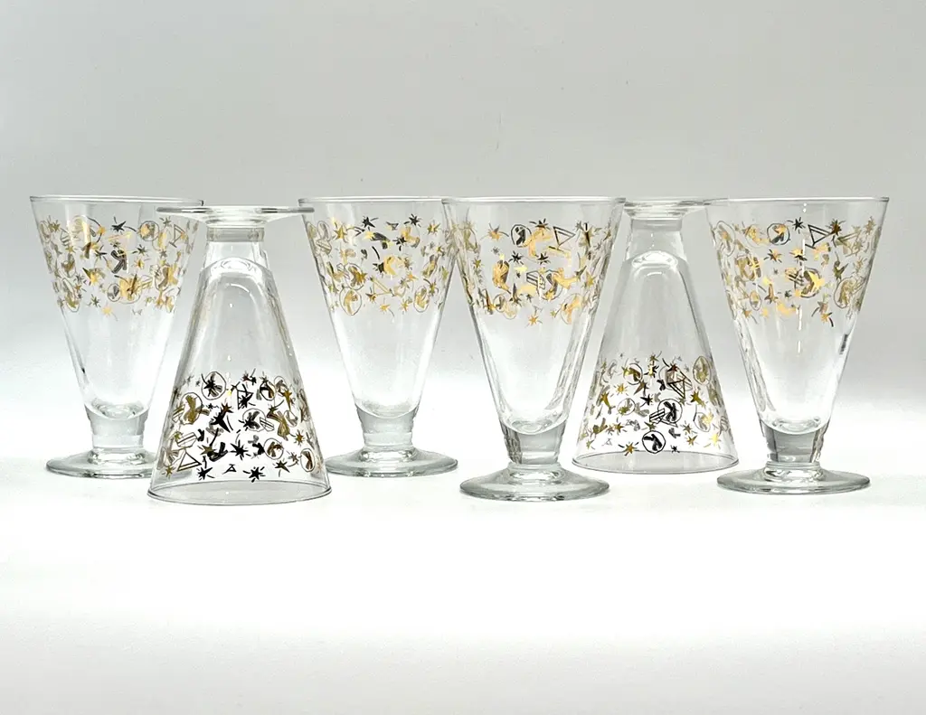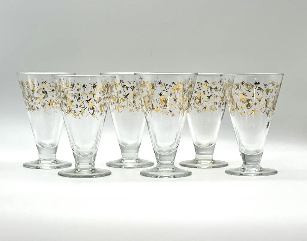 Mid-Century Modern c. 1960s gold confetti motif trumpet cocktail glasses with images of confetti, martini glasses, cakes and stars. Versatile cocktail glasses. Each glass holds approx. 8 fl. oz. if filled. A 7th extra glass will be included at no additional charge with more substantial wear to overlay pattern.