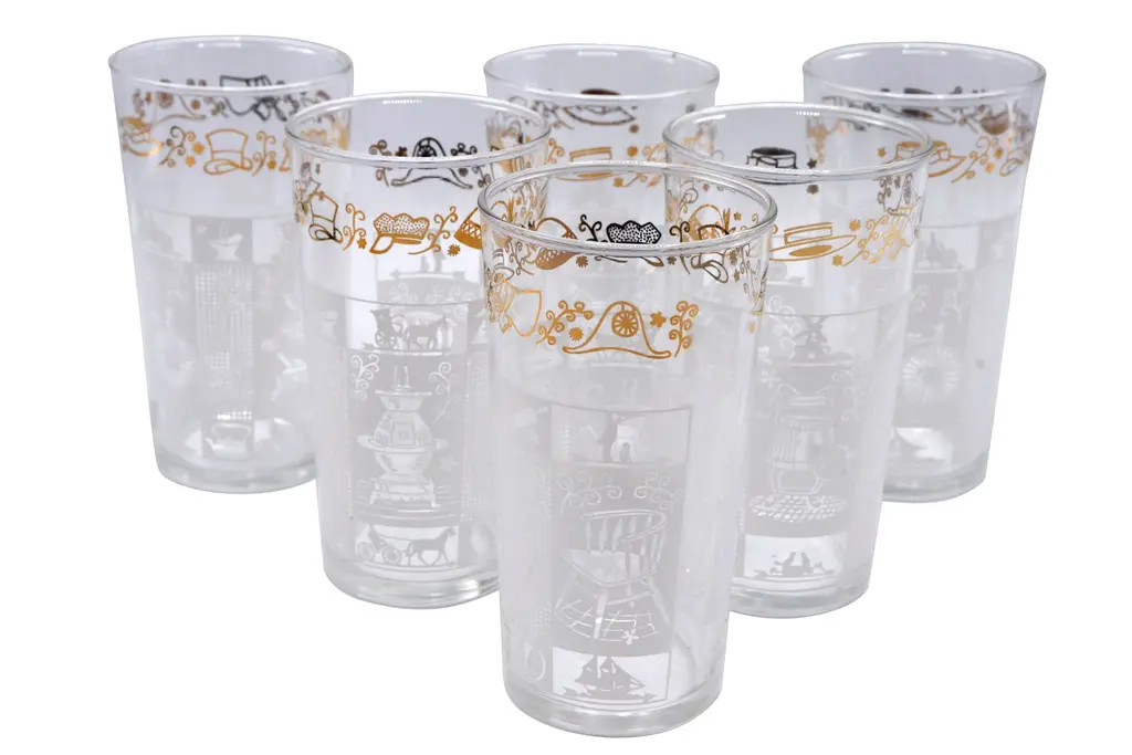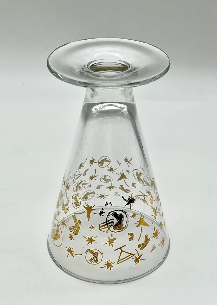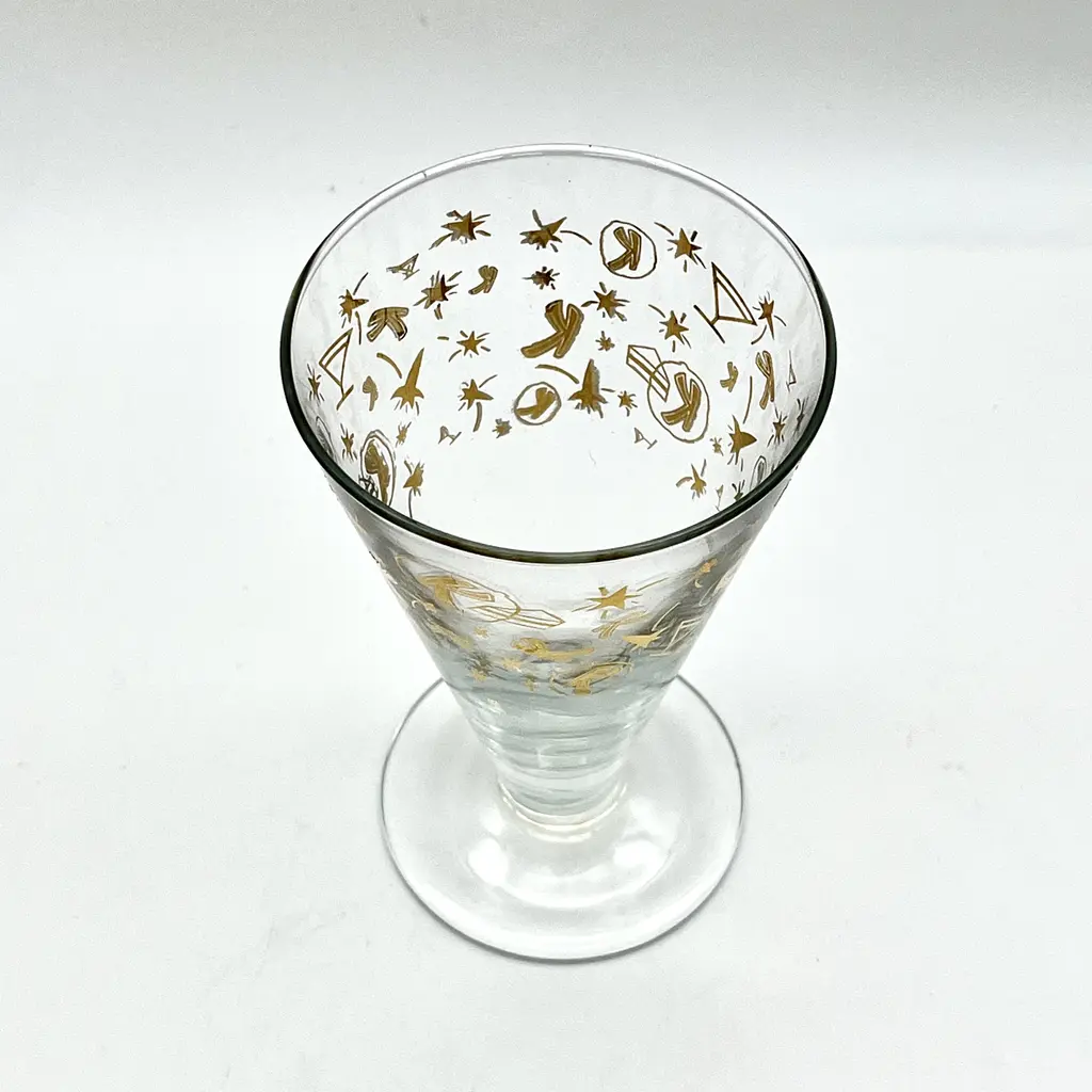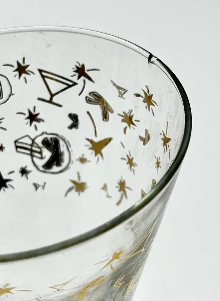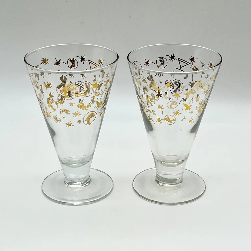 Mid-Century Modern c. 1960s gold confetti motif trumpet cocktail glasses with images of confetti, martini glasses, cakes and stars. Versatile cocktail glasses. Each glass holds approx. 8 fl. oz. if filled. A 7th extra glass will be included at no additional charge with more substantial wear to overlay pattern.