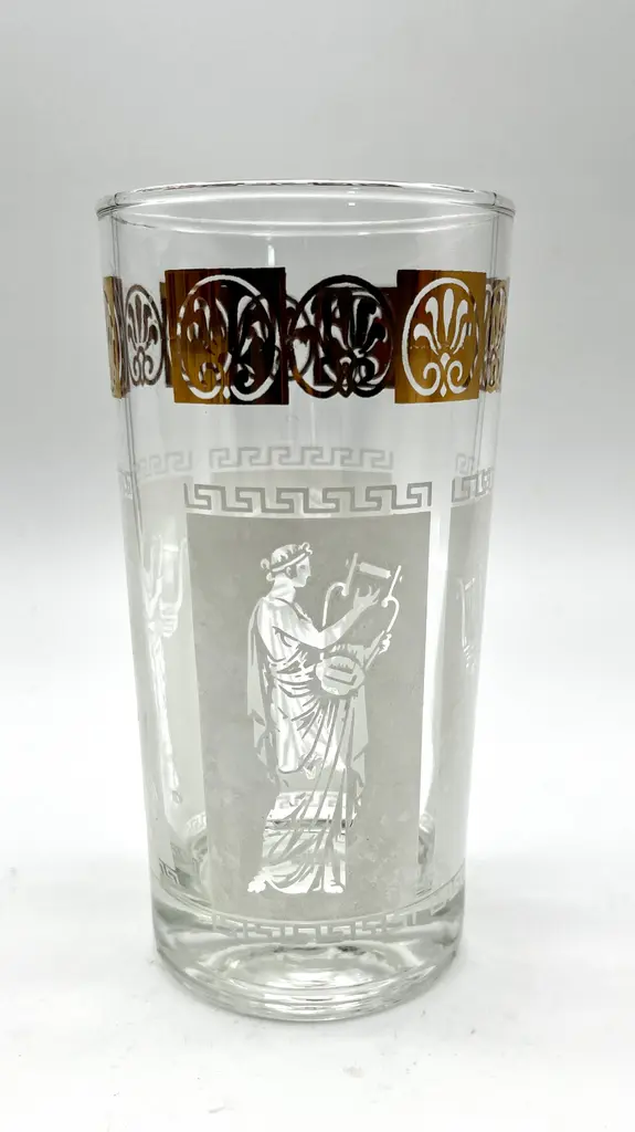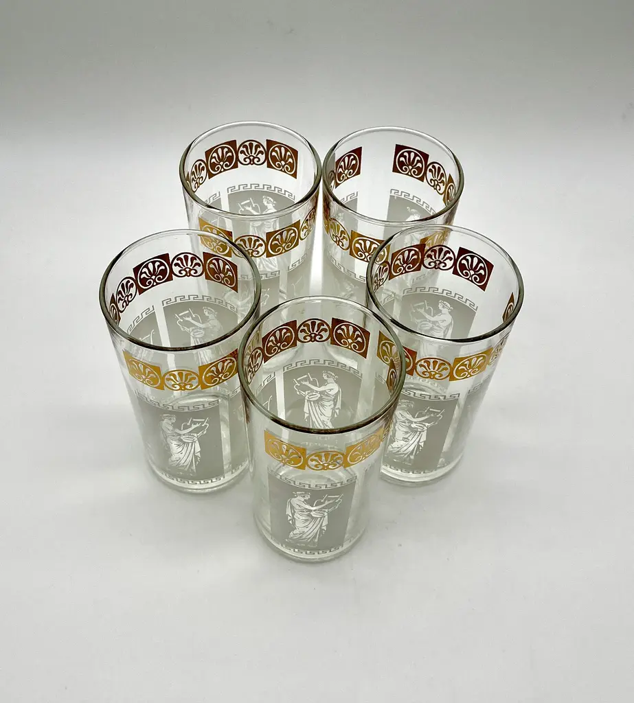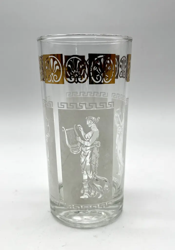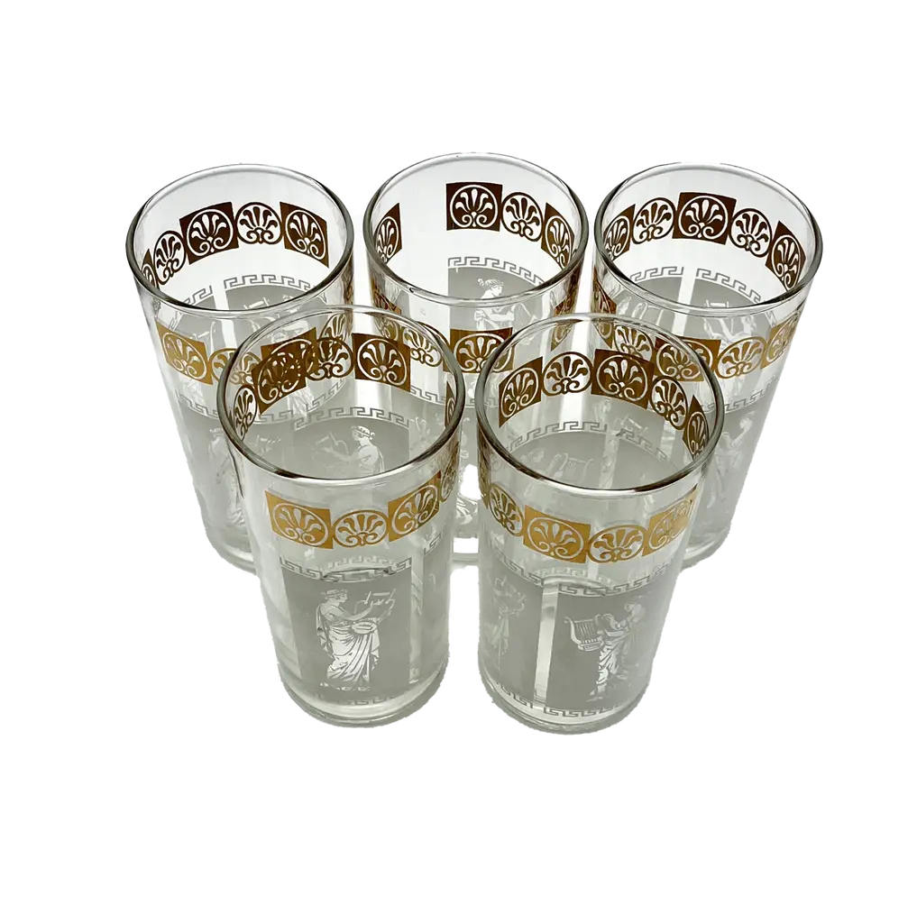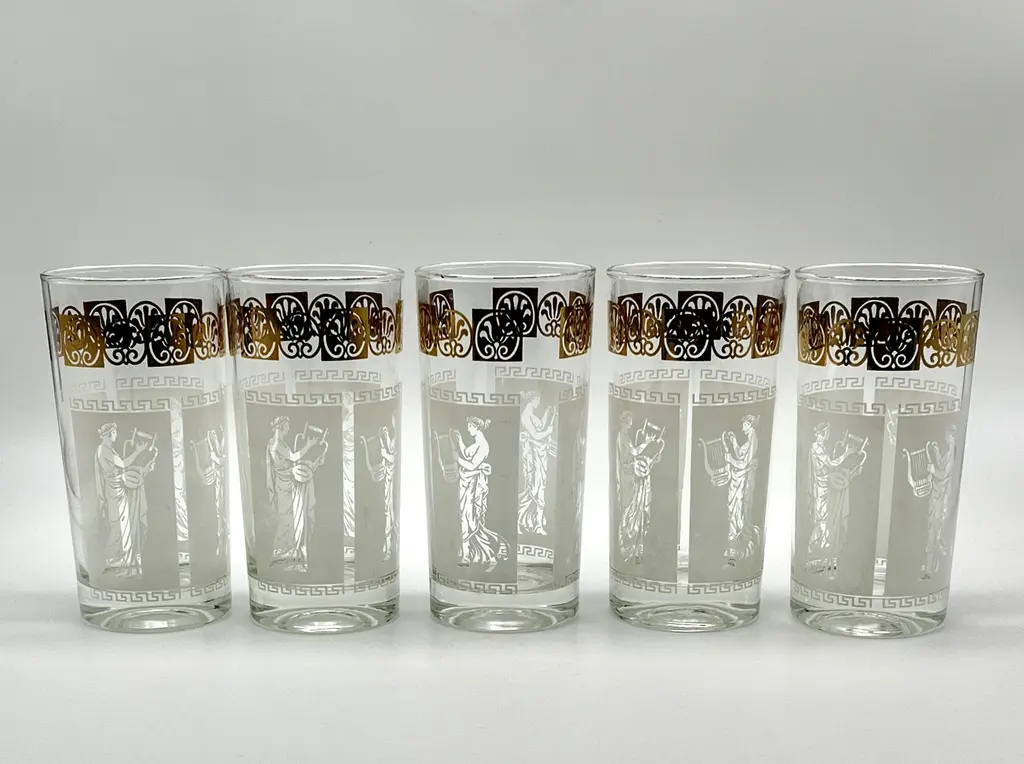 C.1960s set of five high ball white and gold cocktail cockatil glasses. Each glass features a rectangular "cameo" of ancient greek figures playing a lyre, bordered with a greek key design. Upper edge features a band of gold blocked stylized lyre shapes. 5.5"H x 2.75"Dia. (each). Each glass is in excellent vintage condition, ready for use.