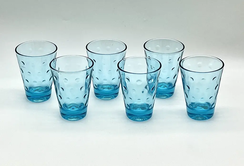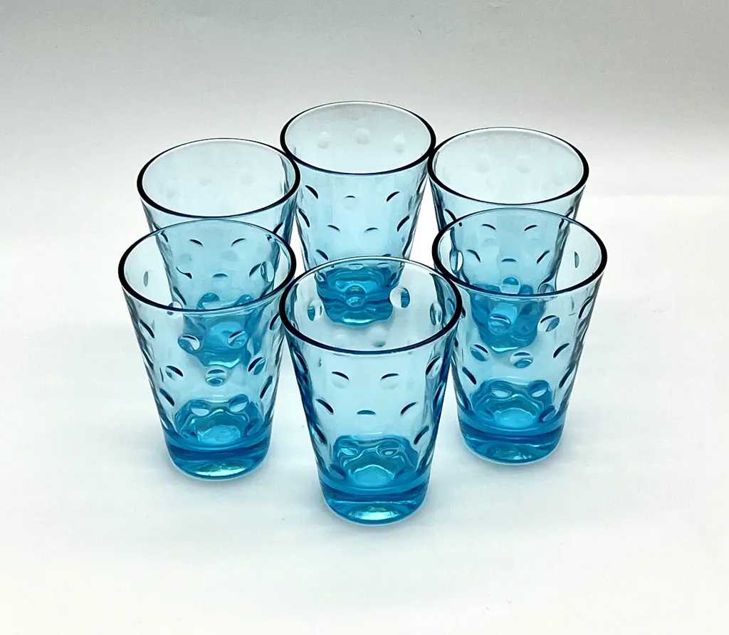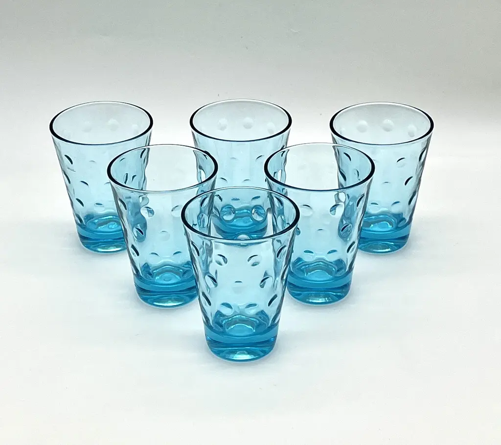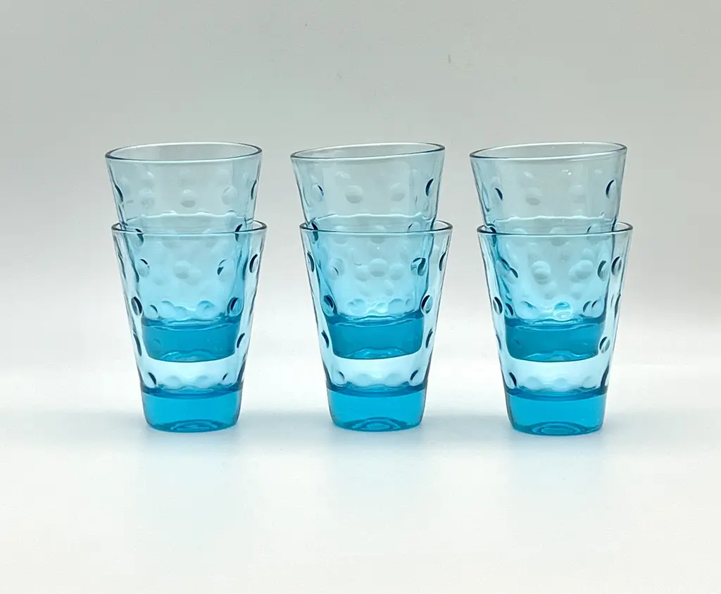 Set of six c. 1960s Mid-Century Modern light blue glass petite drinks glasses with capri dot overall pattern. Versatile drinkware for juice, water or table wine. Bright, light blue. Additional sets of 6 are available in limited quantity to expand upon the collection, if desired.