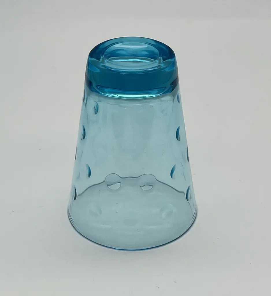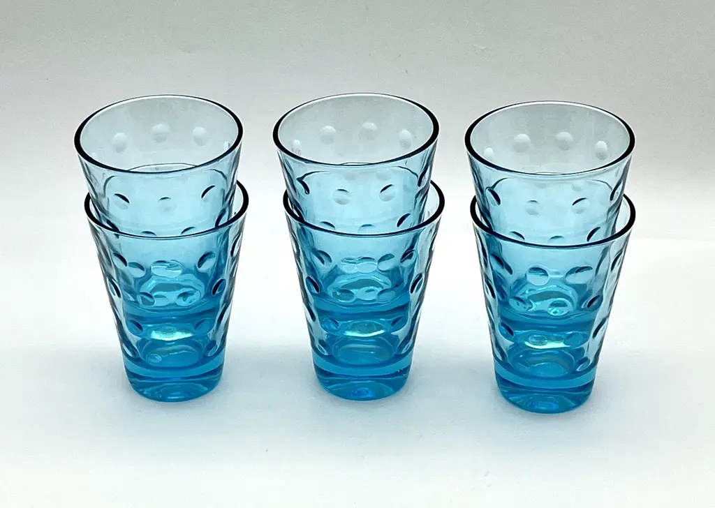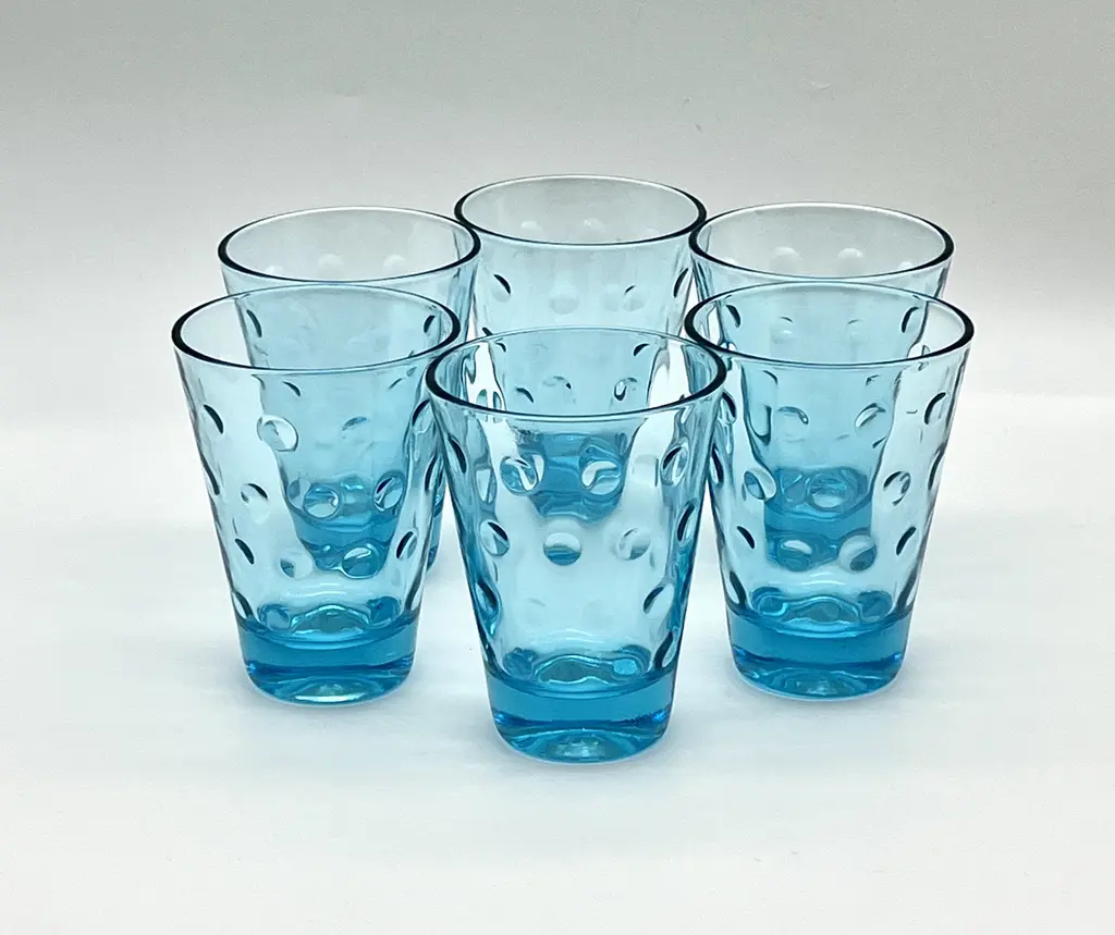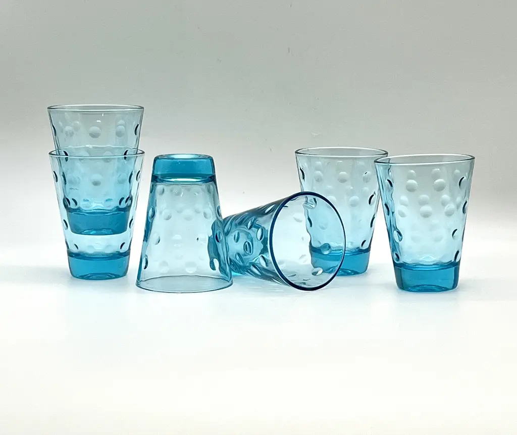 Set of six c. 1960s Mid-Century Modern light blue glass petite drinks glasses with capri dot overall pattern. Versatile drinkware for juice, water or table wine. Bright, light blue. Additional sets of 6 are available in limited quantity to expand upon the collection, if desired.