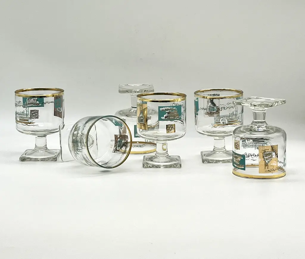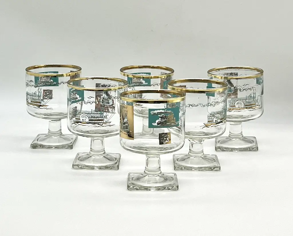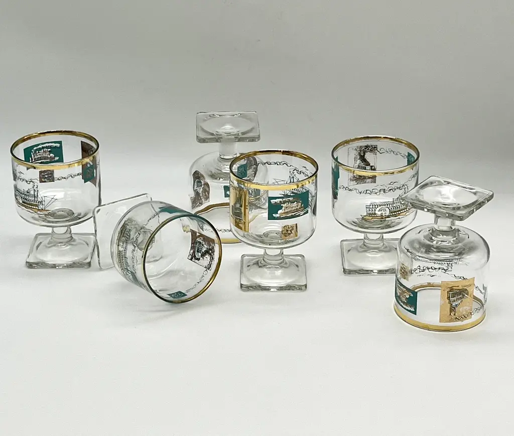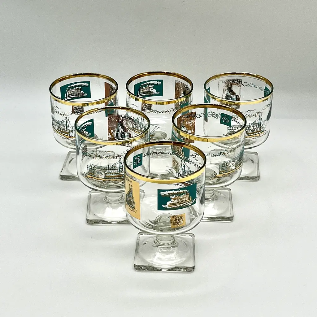 Set of six c. 1960s Mid-Century Modern square footed cocktail glasses with 22K gold and turquoise riverboat motif by Libbey. Libbey glass was founded in 1818 in East Cambridge, MA. These commemorative glasses were made for Southern Comfort's 1968 Centennial. The initials "SC" are visible on one of the steamboat's paddle wheels on each glass. 22K gold rim is featured on each glass.